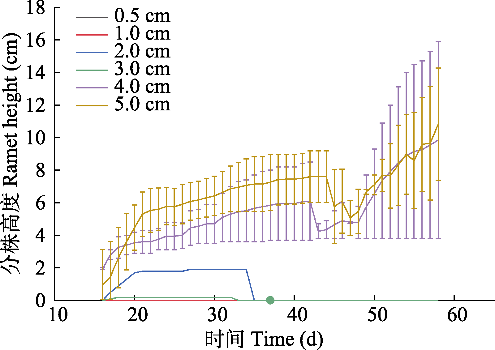 图2 羊草不同初始长度根茎片段生成的克隆分株高度随时间的变化(平均值±标准误)。