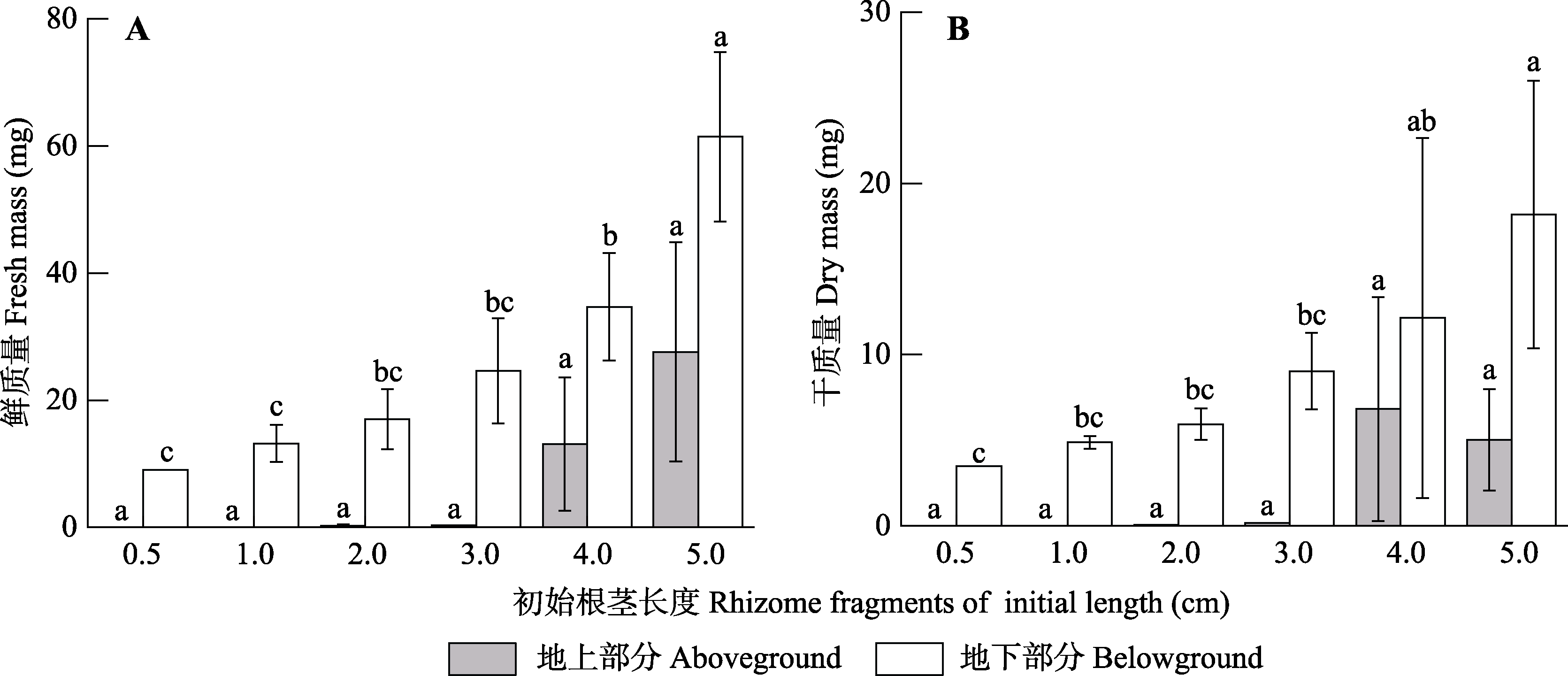 图3 羊草不同初始长度根茎片段生成的分株地上和地下鲜质量与干质量(平均值±标准误)。不同小写字母表示不同初始长度的根茎片段之间差异显著(p < 0.05)。