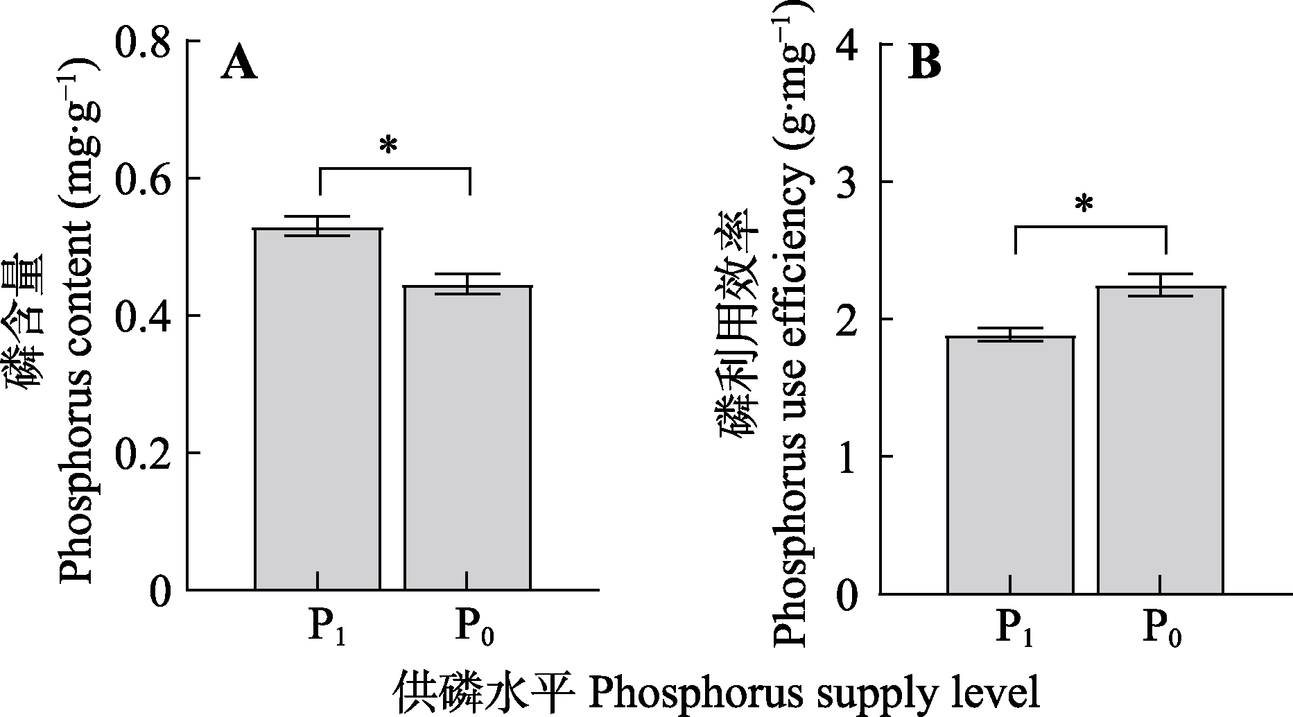 图1 不同供磷水平下添加外源正癸烷对杉木根系磷含量(A)及磷利用效率(B)的影响(平均值±标准误)。P0, 不供磷下添加正癸烷处理; P1, 充足供磷下添加正癸烷处理。*, p < 0.05。
