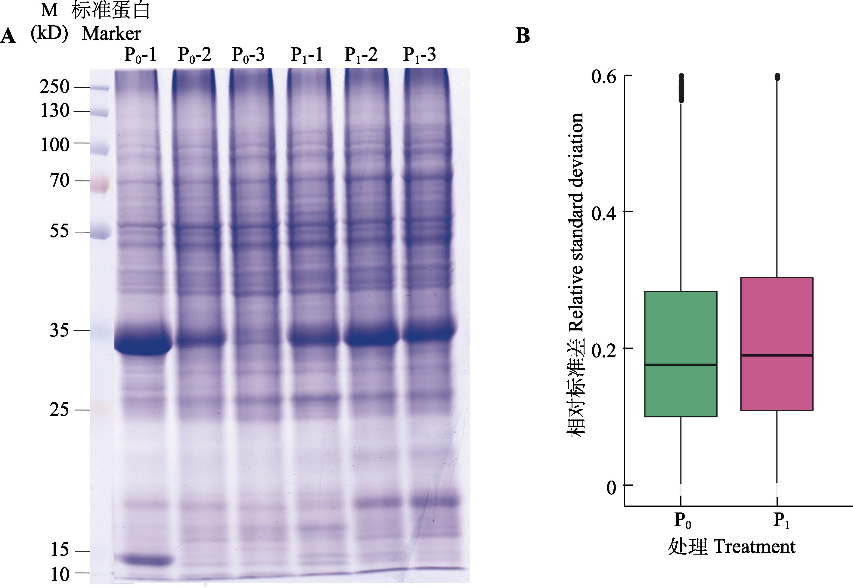 图2 不同处理下杉木根系蛋白组学的蛋白凝胶电泳图(A)和相对标准差分析(B)。M, 标准分子量。P0, 不供磷下添加正癸烷处理; P1, 充足供磷下添加正癸烷处理。