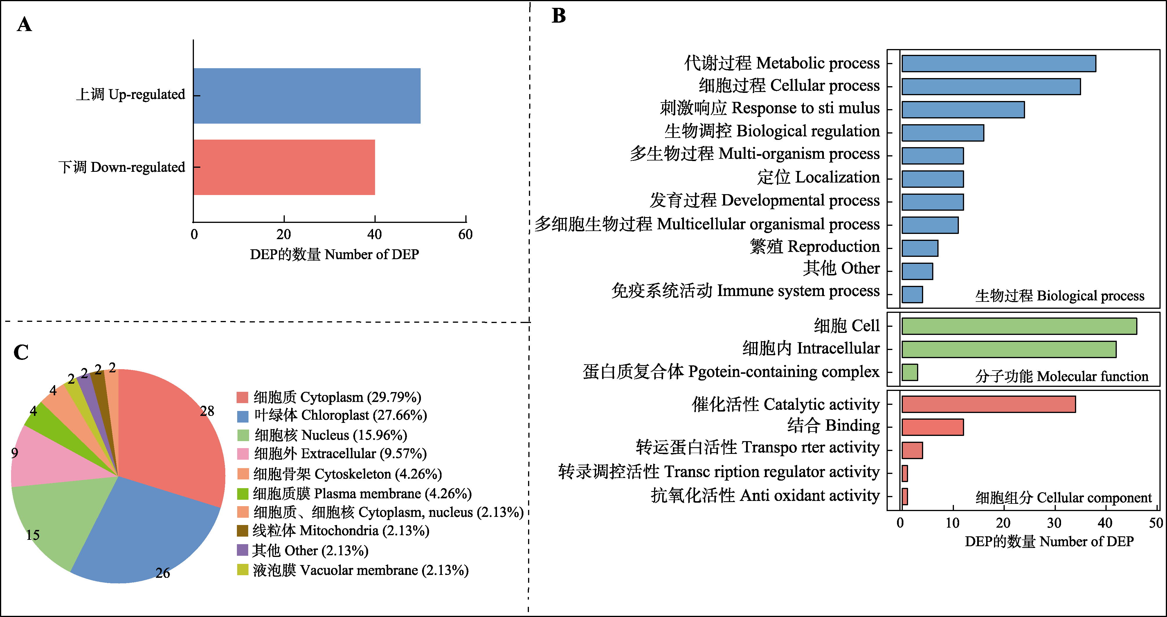 图3 不同处理下杉木根系差异表达蛋白(DEP)的数量(A)、GO分类注释(B)及亚细胞定位(C)。