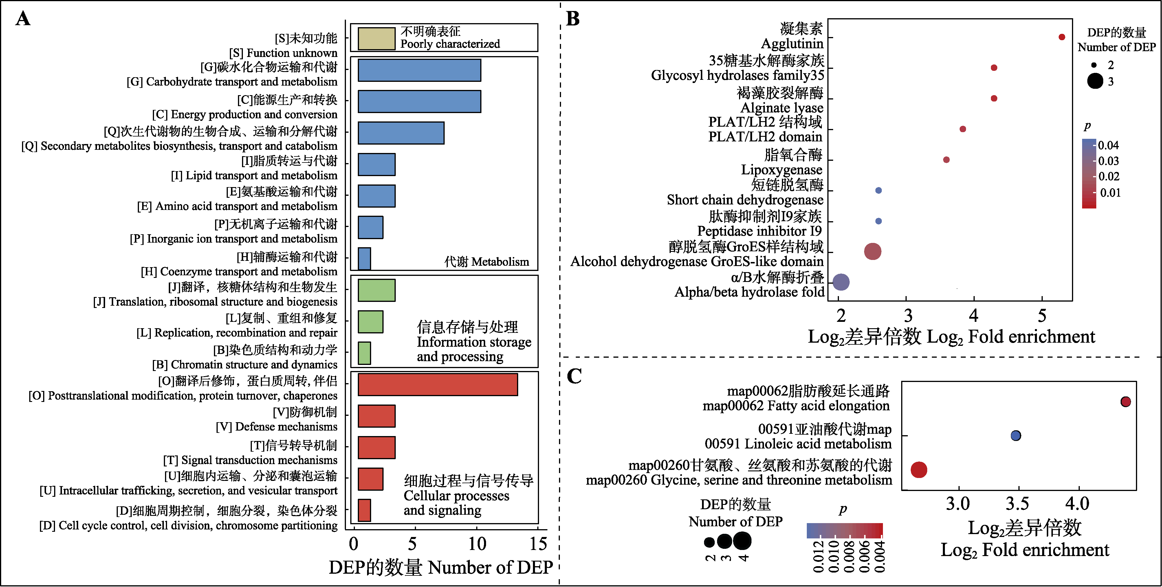 图4 不同处理下杉木根系差异表达蛋白(DEP)的KOG注释(A)、蛋白结构域(B)和KEGG通路(C)富集情况。