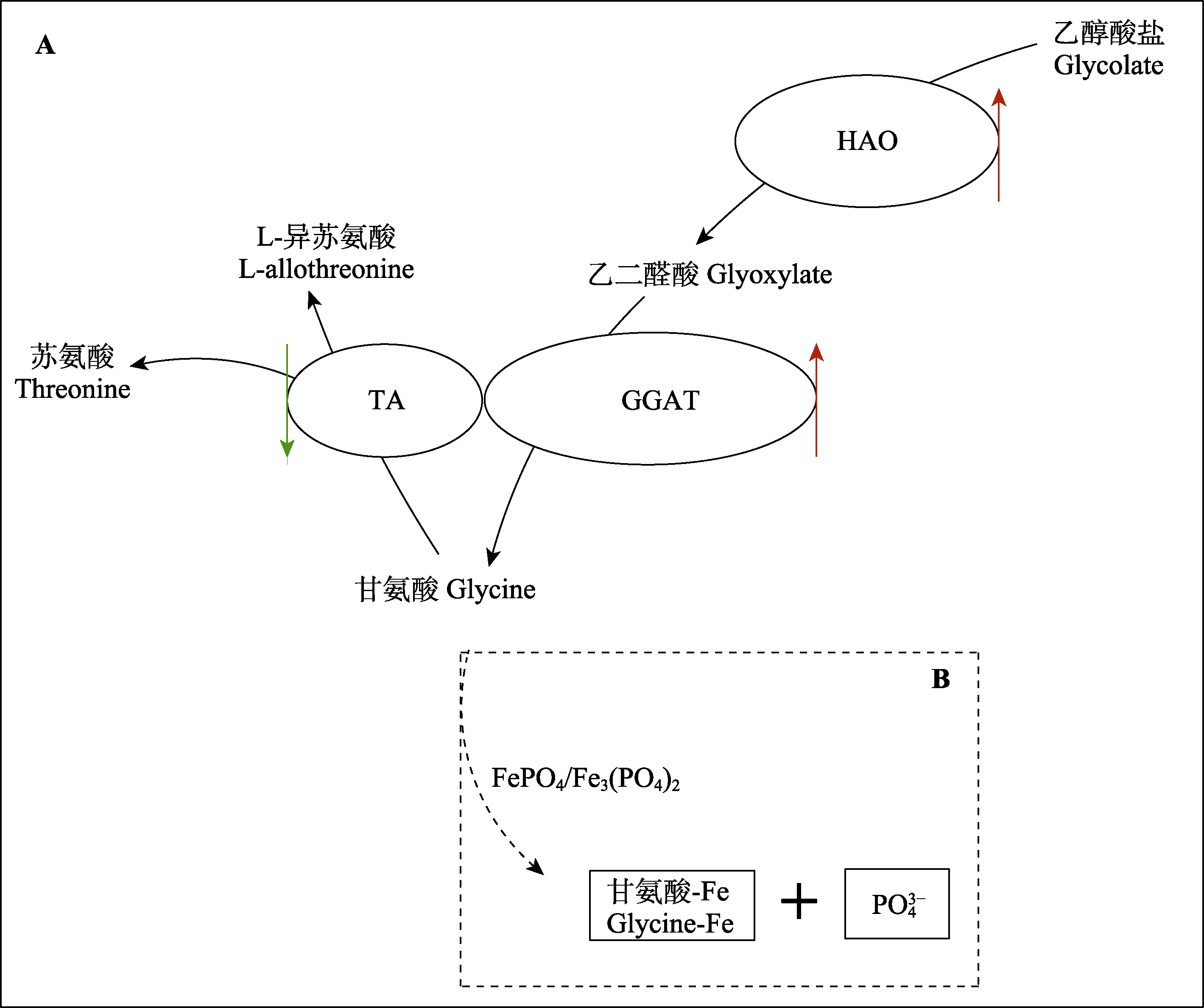 图5 差异表达蛋白(DEP)在甘氨酸代谢相关途径中富集情况(A)和甘氨酸活化难溶性铁磷过程(B)。红色箭头表示DEP在P0 vs. P1中上调表达, 绿色箭头表示DEP在P0 vs. P1中下调表达。B引用于Trevisan等(2024)。GGAT, 谷氨酸-乙二醛氨基转移酶; HAO, (S)-2-羟基酸氧化酶; TA, 苏氨酸醛缩酶。