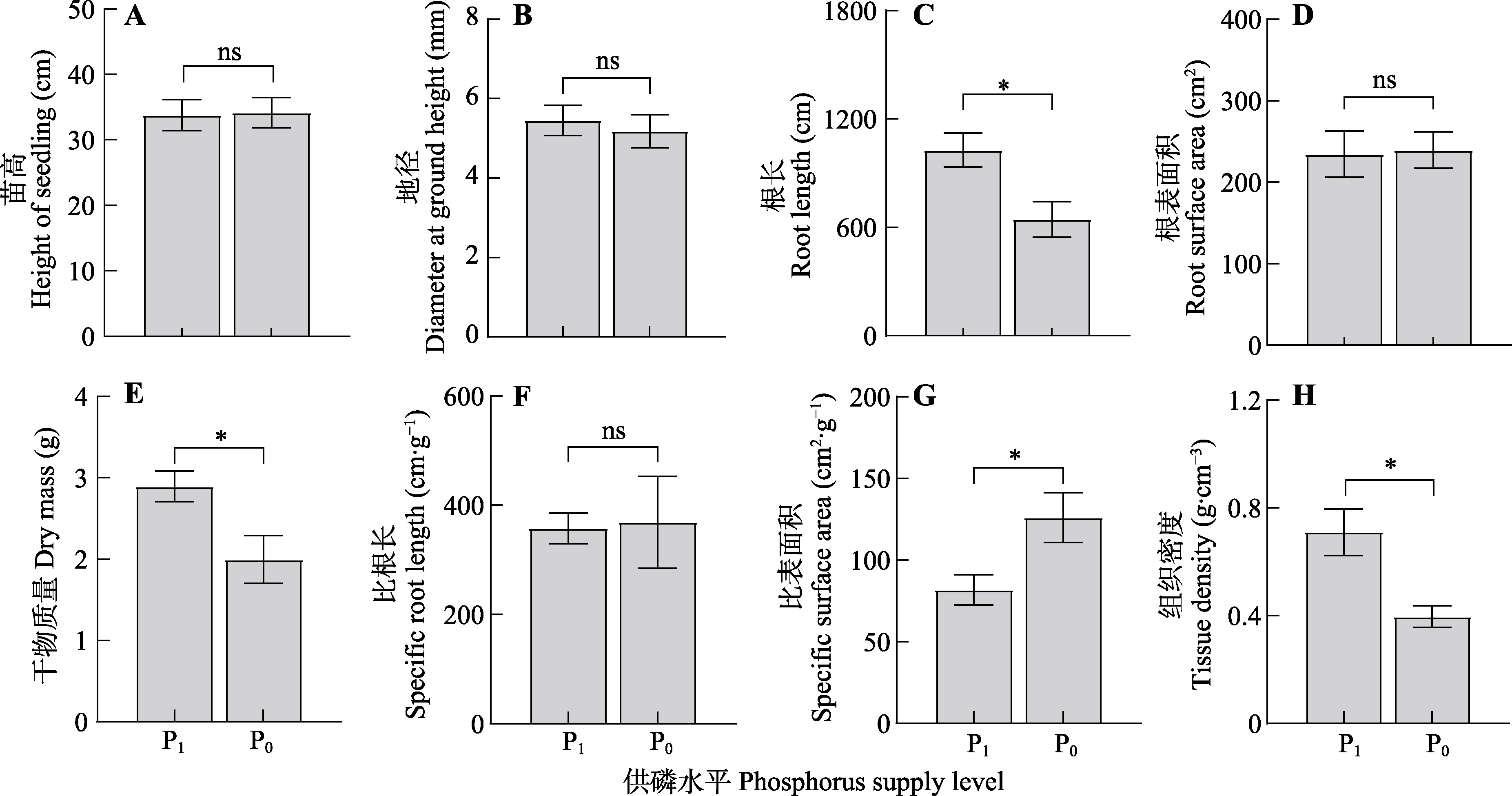 图6 不同供磷水平下添加外源正癸烷后杉木苗高(A)、地径(B)、根长(C)、根表面积(D)、干物质量(E)、比根长(F)、比表面积(G)和组织密度(H)的影响(平均值±标准误)。P1, 充足供磷处理下添加正癸烷; P0, 不供磷处理下添加正癸烷。*, p < 0.05; ns, p ≥ 0.05。