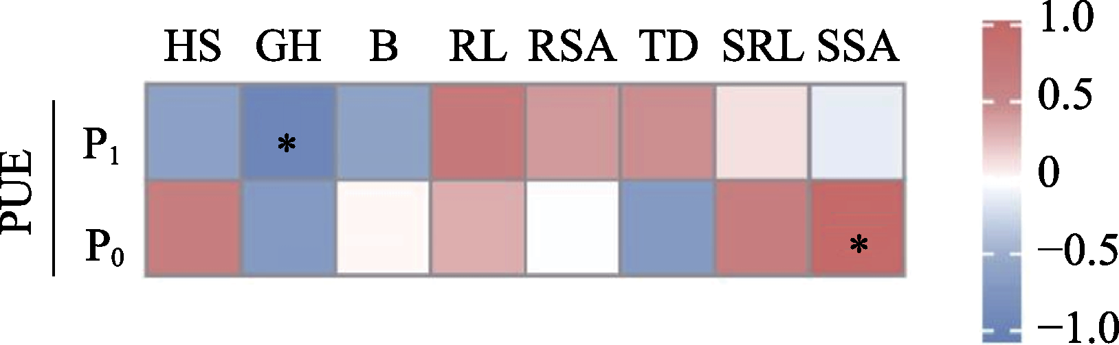 图7 不同处理下杉木根系磷利用效率与各形态指标之间相关性分析。P1, 充足供磷处理下添加正癸烷; P0, 不供磷处理下添加正癸烷。*, p < 0.05。B, 干物质量; GH, 地径; HS, 苗高; PUE, 磷利用效率; RL, 根长; RSA, 根表面积; SRT, 比根长; SSA, 比表面积; TD, 组织密度。