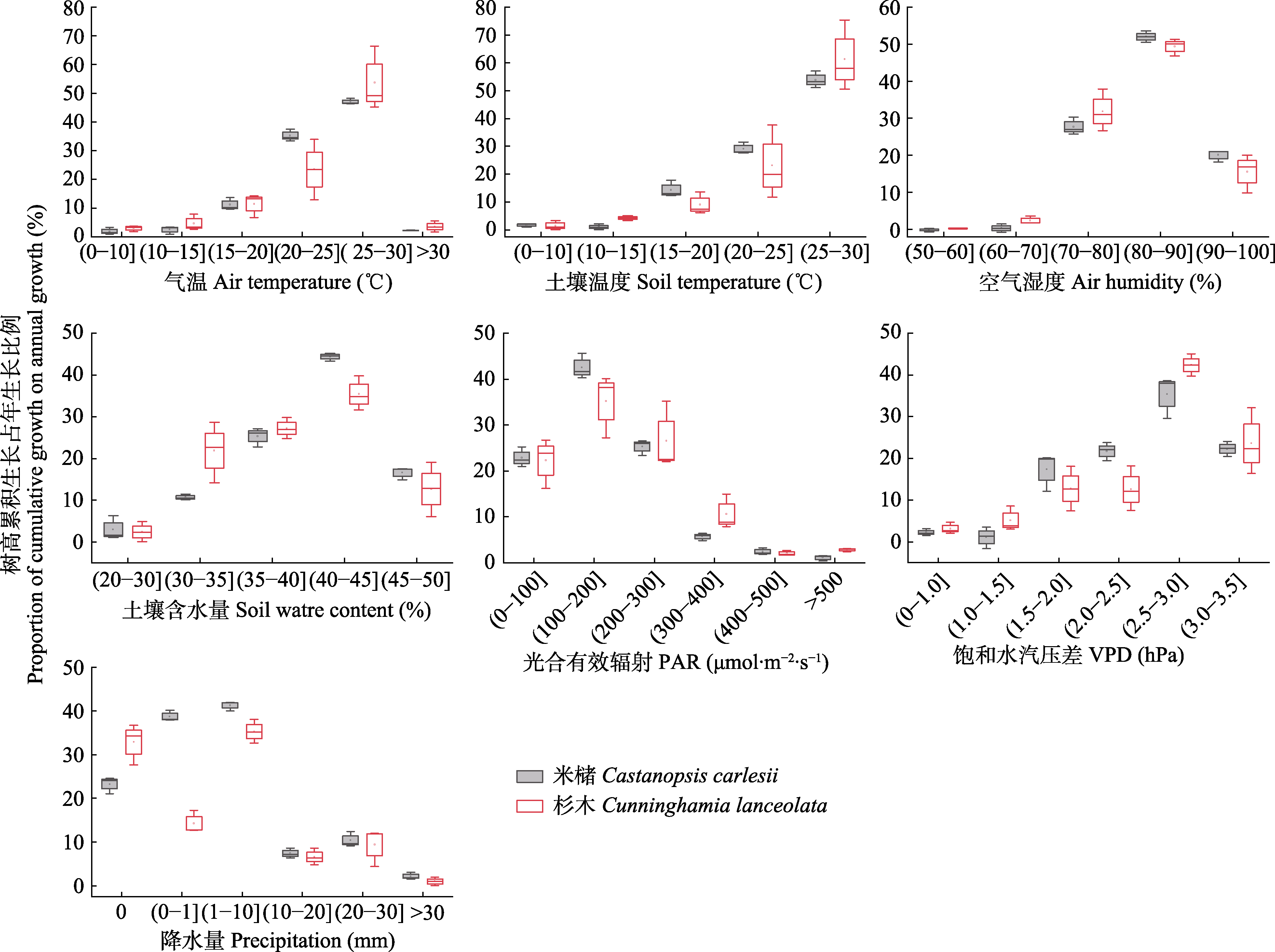 Fig. 4 Proportion of cumulative growth on annual growth in specific climatic intervals for Castanopsis carlesii and Cunninghamia lanceolata (mean ± SE). PAR and VPD are photosynthetically active radiation and vapor pressure deficit, respectively.