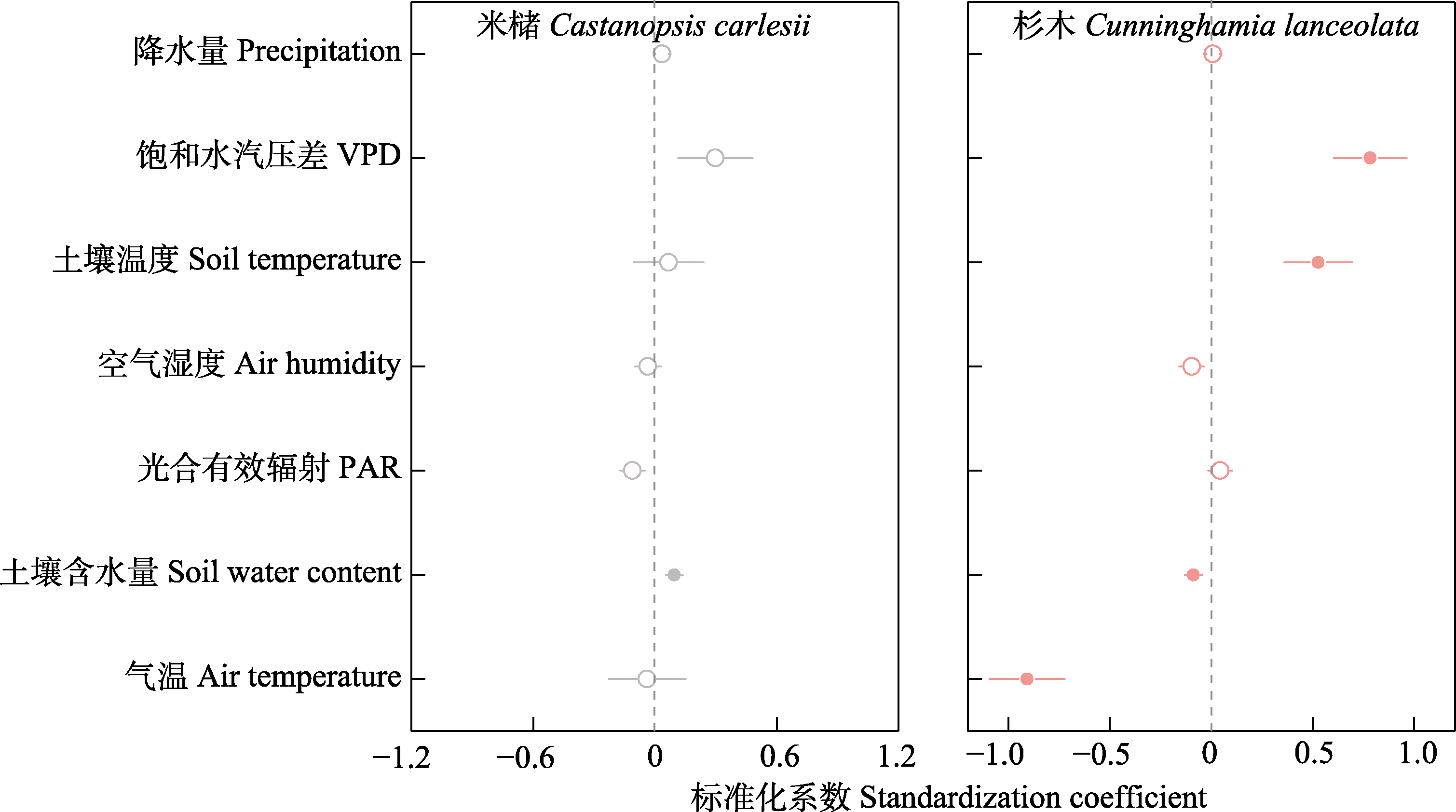 Fig. 5 Standardized coefficients of the linear mixed-effects models for Castanopsis carlesii and Cunninghamia lanceolata. Significant levels (p < 0.05) were marked in closed circles, and significance levels (p > 0.05) were marked in hollow circles. PAR and VPD are photosynthetically active radiation and vapor pressure deficit, respectively.