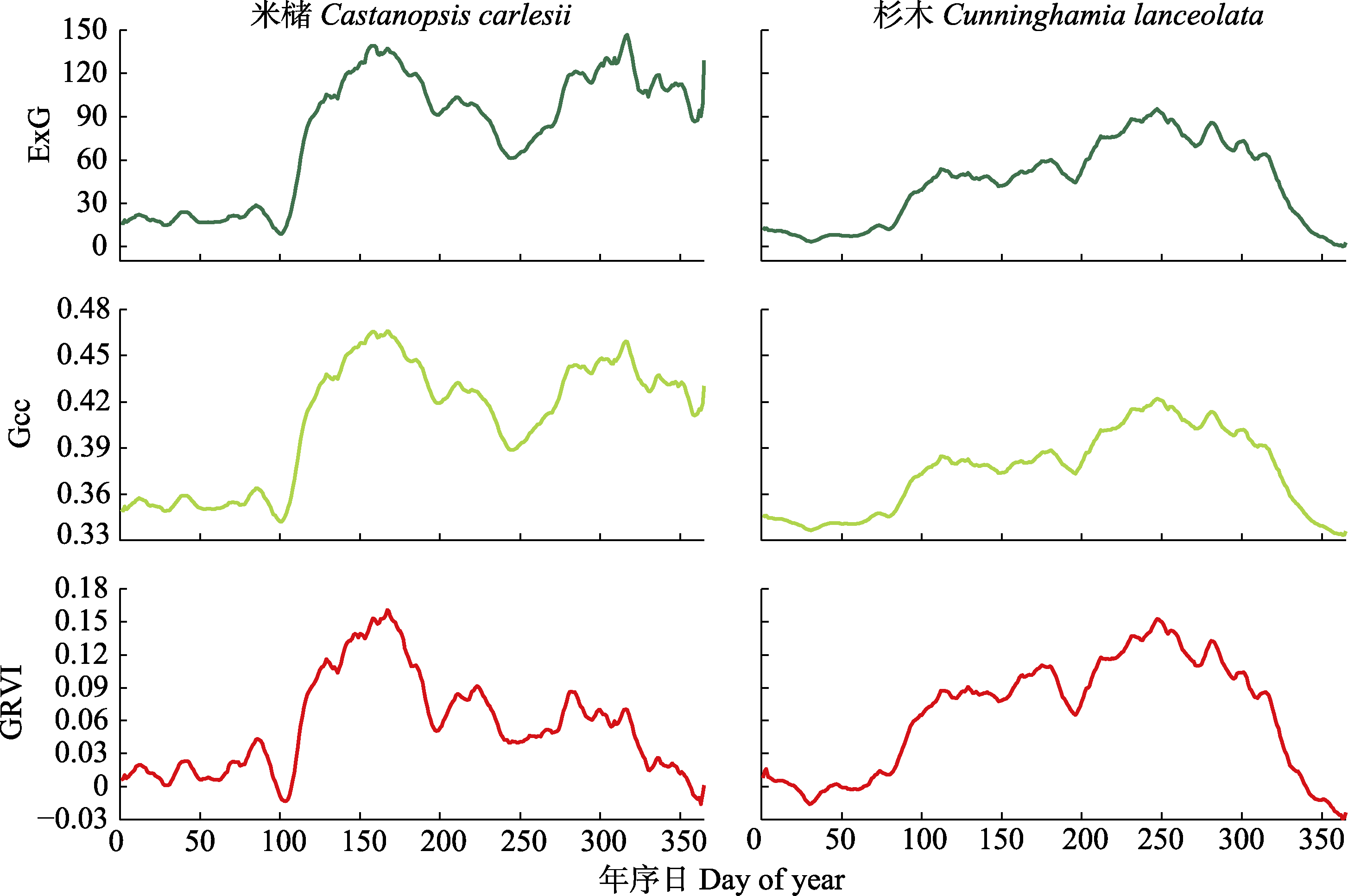 图6 米槠和杉木冠层颜色指数时间序列曲线。ExG、Gcc和GRVI分别表示绝对绿度指数、绝对绿度指数、绿红植被指数。