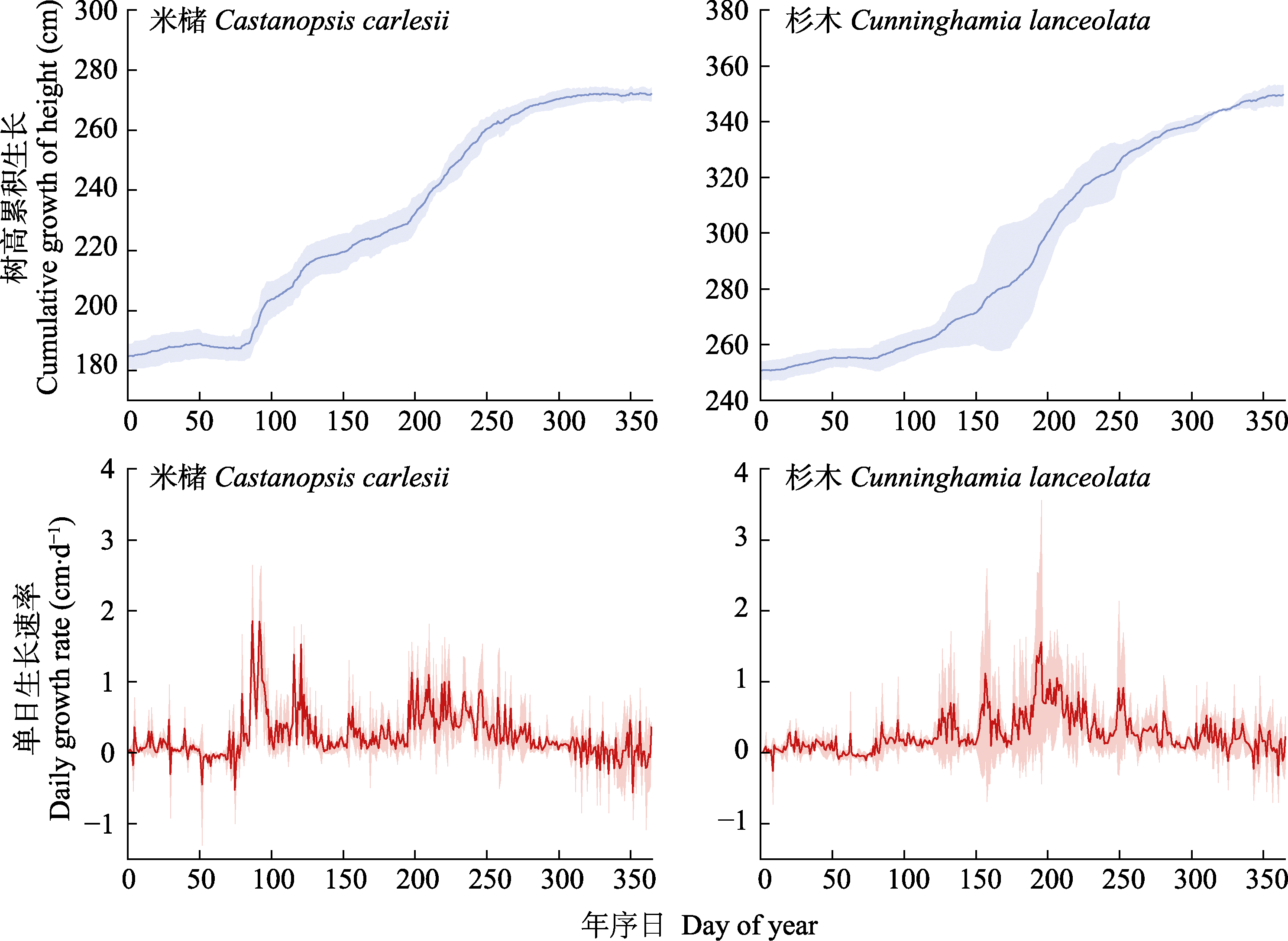 Fig. 2 Hight cumulative growth and growth rate of Castanopsis carlesii and Cunninghamia lanceolata. Shaded areas represent standard errors.