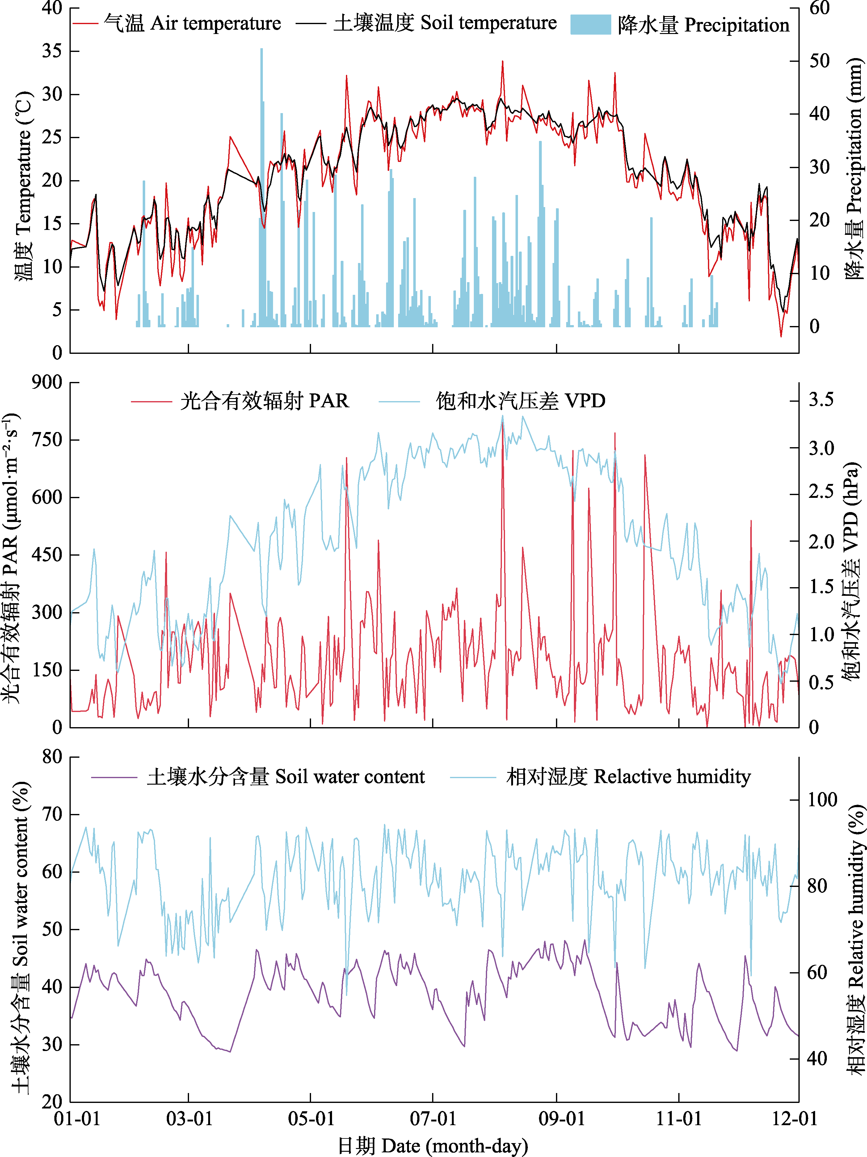 图3 福建三明森林生态系统国家野外科学观测研究站环境因子变化特征。