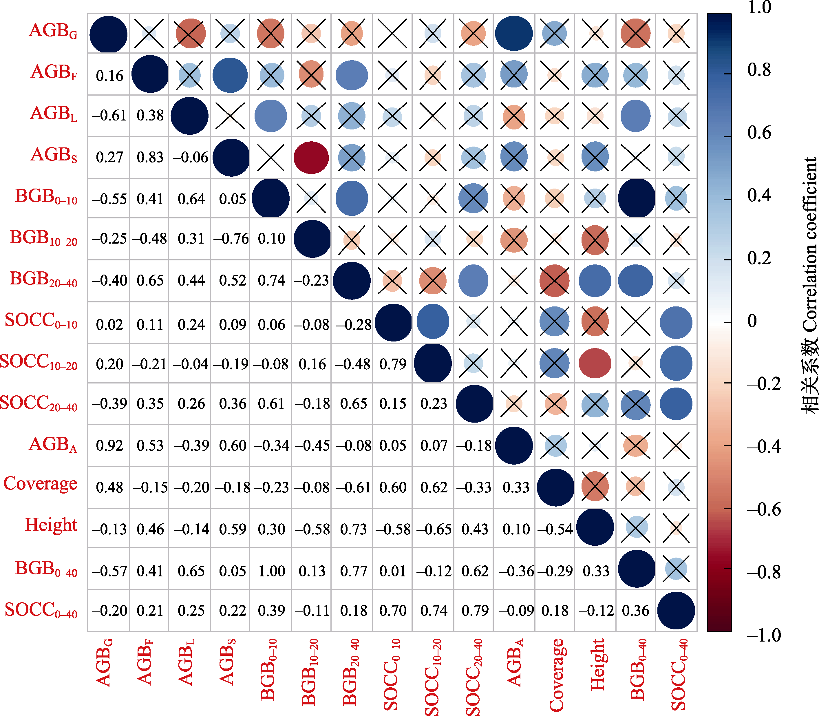 图3 地上生物量、地下生物量及土壤有机碳含量的响应比与主要因子响应比的Pearson相关性分析。图中数字为相关系数。×, p > 0.05. AGBG、AGBF、AGBL、AGBS、AGBA, 禾草类、杂类草、豆科类、莎草类和群落地上生物量; BGB0-10、BGB10-20、BGB20-40、BGB0-40, 0-10、10-20、20-40 cm土层和总地下生物量; Coverage, 群落盖度; Height, 群落最大高度; SOCC0-10、SOCC10-20、SOCC20-40、SOCC0-40, 0-10、10-20、20-40 cm土层和总土壤有机碳含量。