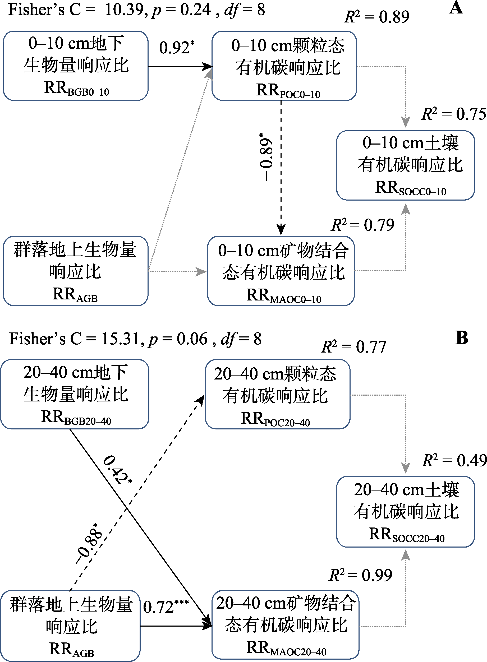 图4 0-10 cm (A)和20-40 cm (B)土层土壤有机碳及其组分含量响应比的结构方程模型。实线、短线和点线分别表示正效应、负效应和无显著效应。线段上的数字为标准作用系数。R2表示模型对响应变量的解释度。***和*表示p < 0.001和p < 0.05。