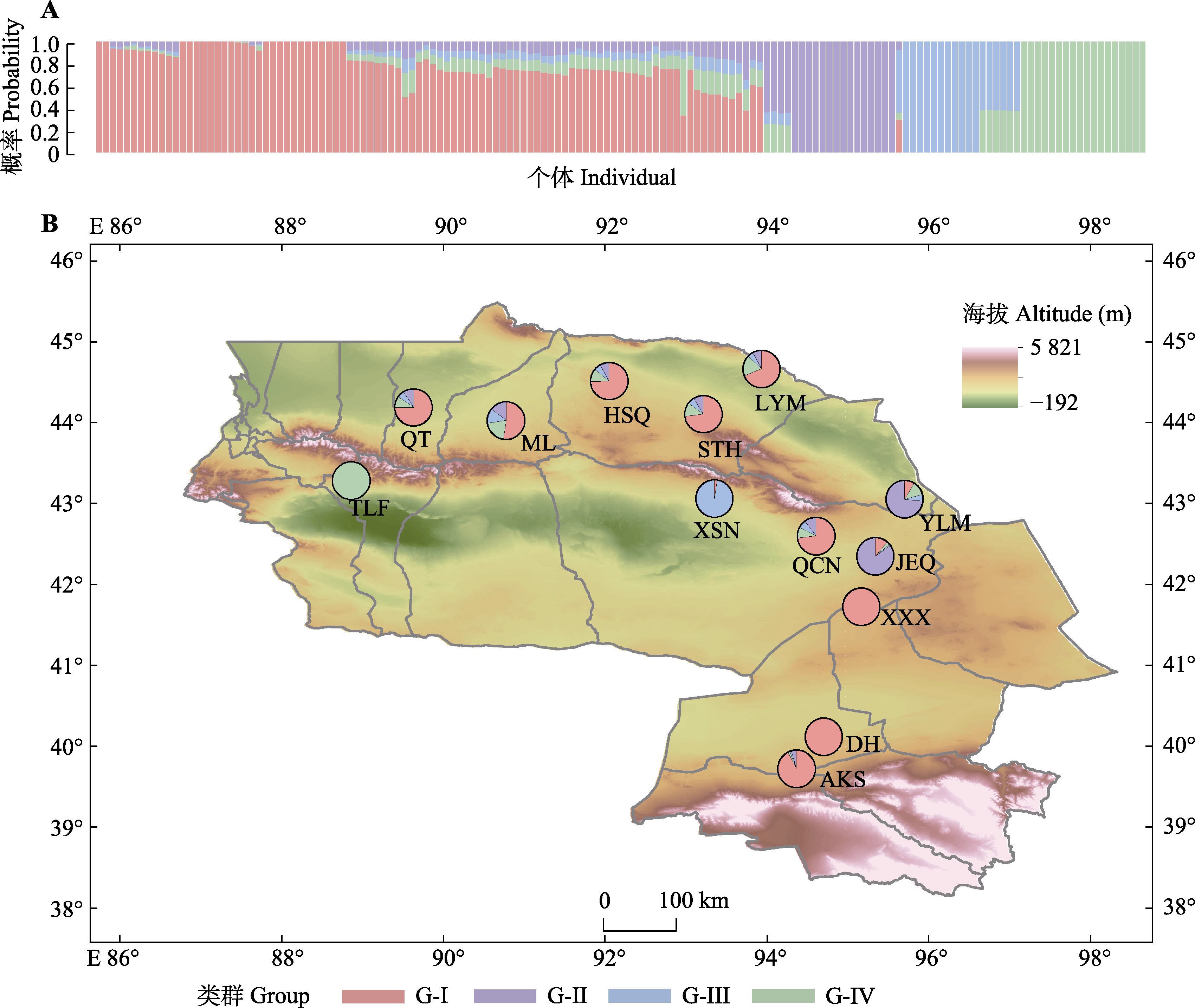 Fig. 2 Results of population genetic structure and geographical distribution of Haloxylon ammodendron obtained based on single nucleotide polymerphism (SNP) markers. A, ADMIXTURE results for 151 samples from 13 populations at K = 4. B, Geographical distribution of the genetic structure of 13 H. ammodendron populations with ADMIXTURE at K = 4. The abbreviations indicate population codes, as shown in Table 1.