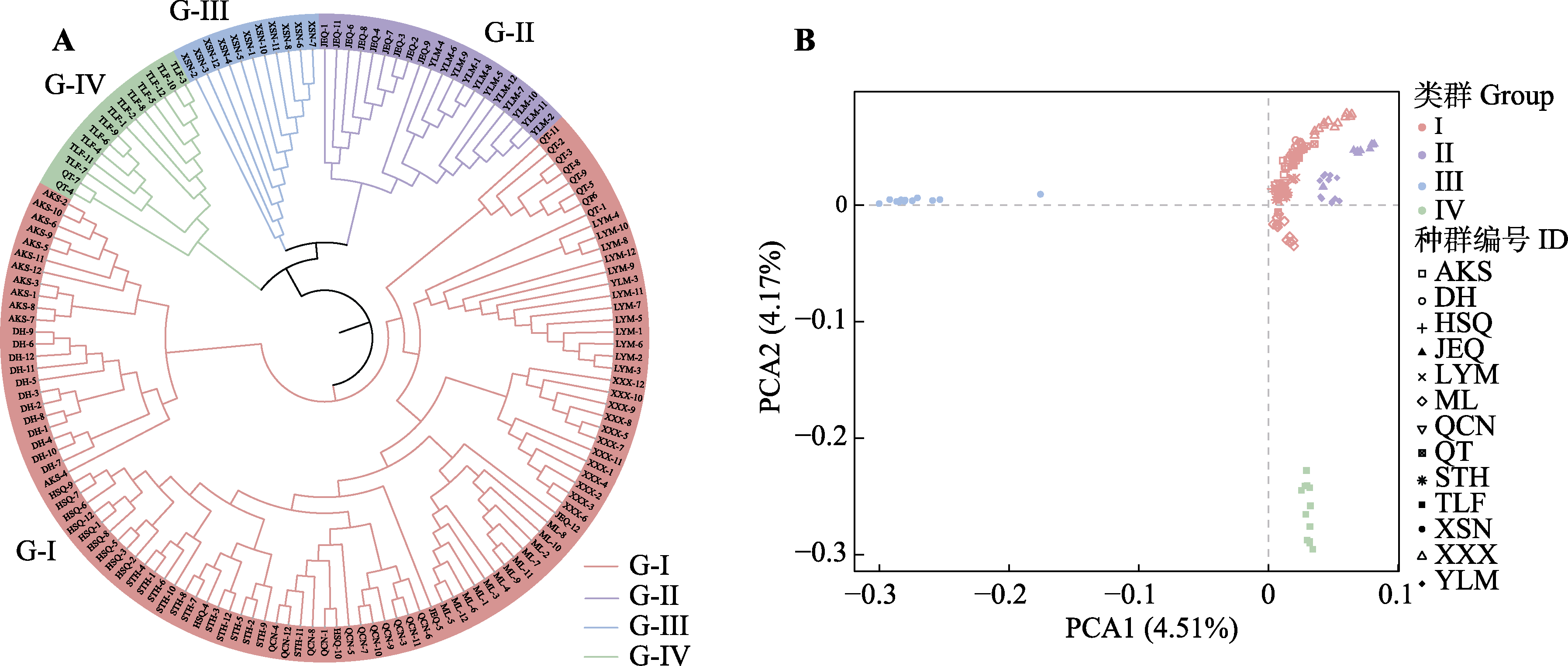 Fig. 3 Neighbor-Joining tree (A) and principal components analysis (PCA) (B) of 13 Haloxylon ammodendron populations obtained based on single nucleotide polymorphism markers. G-I-G-IV represents the four groups divided according to the ADMIXTURE result. The abbreviations indicate population codes, as shown in Table 1.