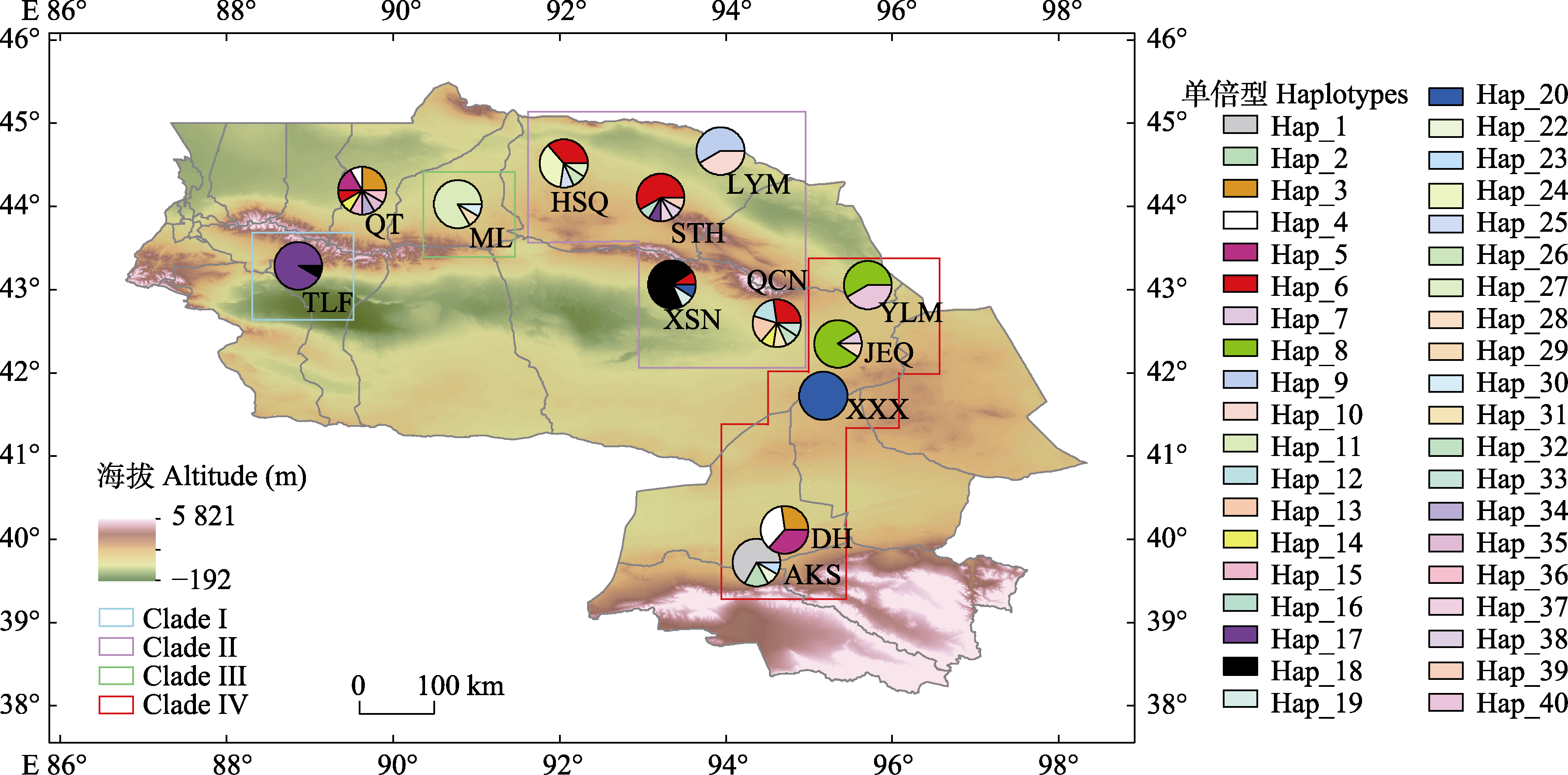 图4 梭梭13个种群的39个叶绿体单倍型的地理分布。图中缩写为13个采样种群编号, 详见表1。扇形图中不同颜色表示不同单倍型, 扇形大小表示该种群中某种单倍型的占比。Clade I-IV表示使用叶绿体基因组划分的4个类群。