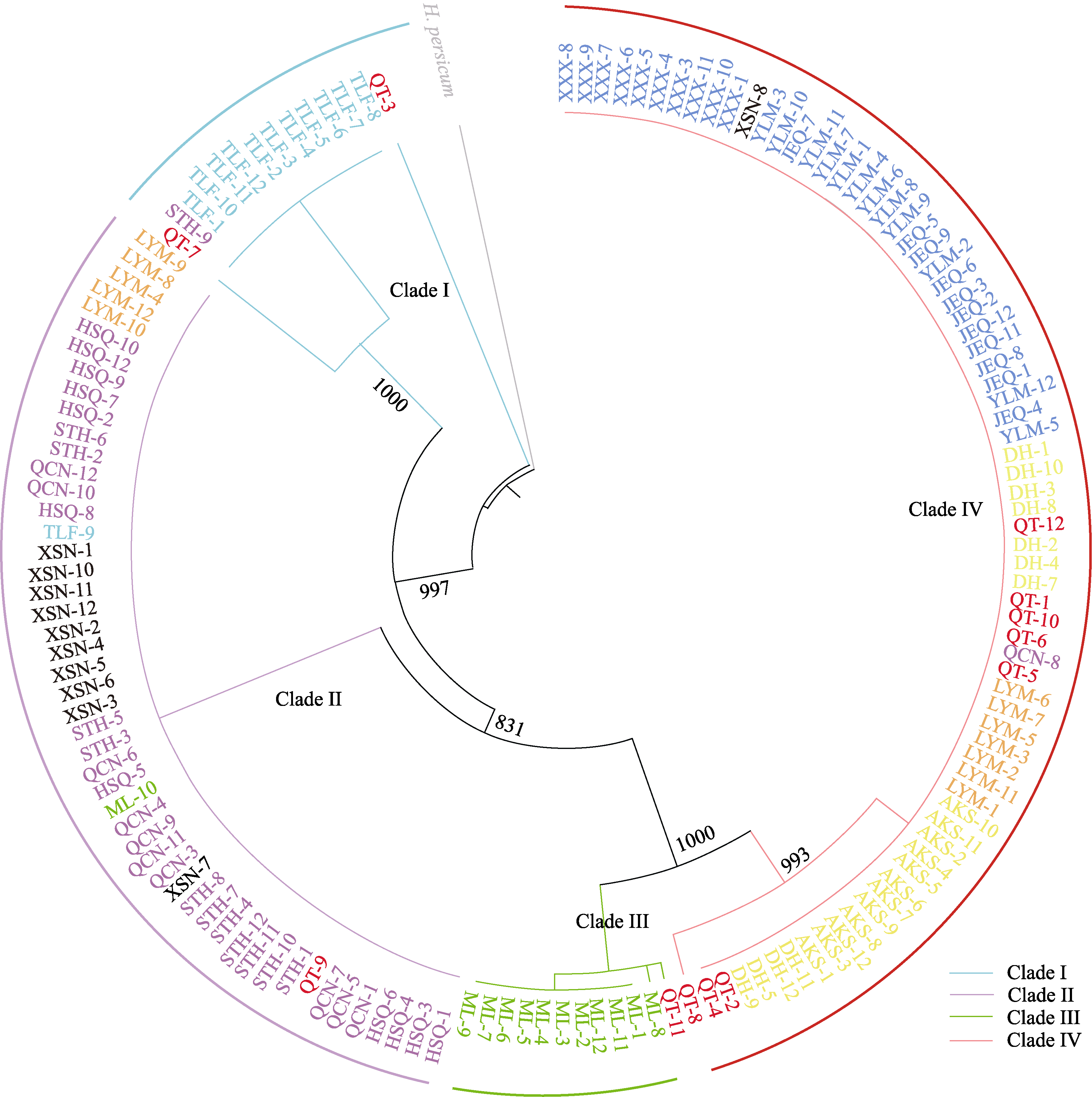 Fig. 5 A maximum likelihood phylogenetic tree of the 149 Haloxylon ammodendron based on chloroplast genomes. The end of each branch represents 149 individuals in 13 H. ammodendron populations, QT is red, TLF is light blue, HSQ, STH, QCN is purple, LYM is orange, XSN is brown, ML is green, JEQ, YLM, XXX is dark blue, AKS, DH is yellow. The information of populations is shown in Table 1. The outmost colored strips (Clade I-IV) indicate four clades divided according to chloroplast genomes.