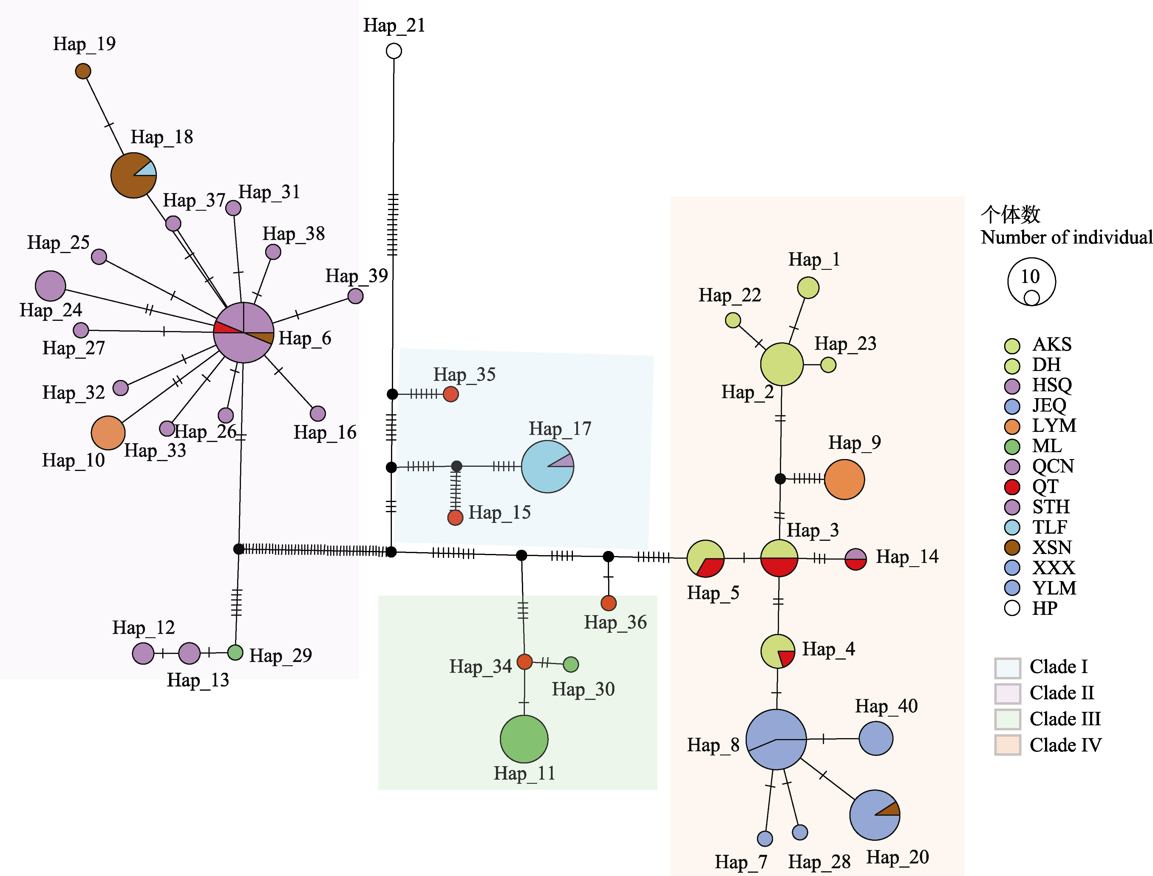 Fig. 6 Haplotype (Hap) network for the 39 haplotypes of Haloxylon ammodendron based on chloroplast genomes. The circles represent haplotypes, the size of the circle represents the number of individuals with the haplotype, and different colors represent different populations. The abbreviations indicate population codes, as shown in Table 1. The black circle represents the unsampled or extinct haplotypes, and the white circle represents the haplotype of Haloxylon persicum. The fan size indicates the proportion of individuals from different populations with a certain haplotype. Clade I-IV represent four clades divided according to chloroplast genomes.
