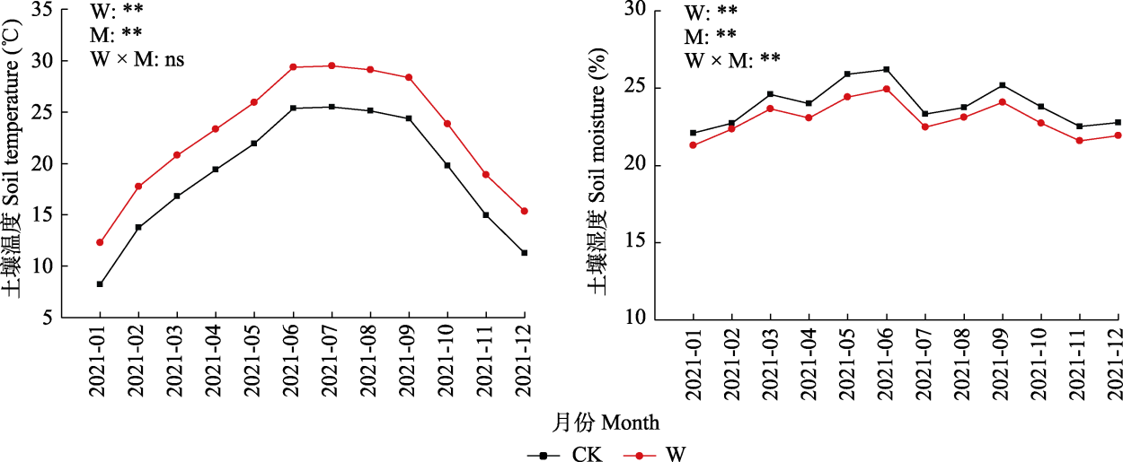 图1 增温对格氏栲天然林土壤温度和湿度的影响。CK, 对照; M, 月份; W, 增温。*, p < 0.05; **, p < 0.01; ns, p > 0.05。