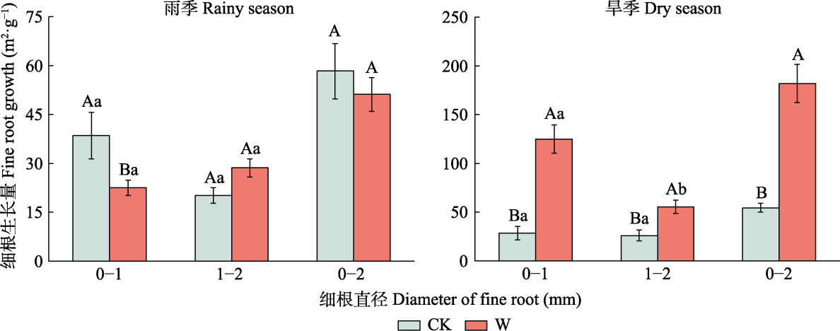 图2 增温对格氏栲天然林细根生长量的影响(平均值±标准误)。CK, 对照; W, 增温。不同大写字母表示同一径级不同处理间差异显著(p < 0.05), 不同小写字母表示同一处理不同径级间差异显著(p < 0.05)。