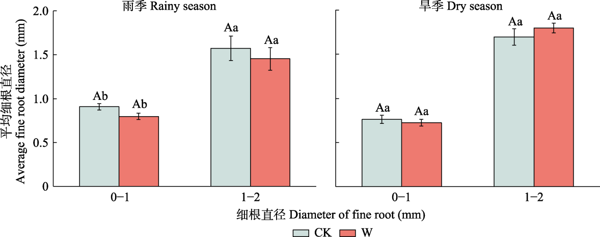 图3 增温对格氏栲天然林细根直径的影响(平均值±标准误)。CK, 对照; W, 增温。不同大写字母表示同一径级不同处理间差异显著(p < 0.05), 不同小写字母表示同一处理不同径级间差异显著(p < 0.05)。