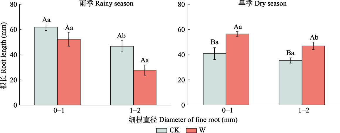图4 增温对格氏栲天然林细根长度的影响(平均值±标准误)。CK, 对照; W, 增温。不同大写字母表示同一径级不同处理间差异显著(p < 0.05), 不同小写字母表示同一处理不同径级间差异显著(p < 0.05)。