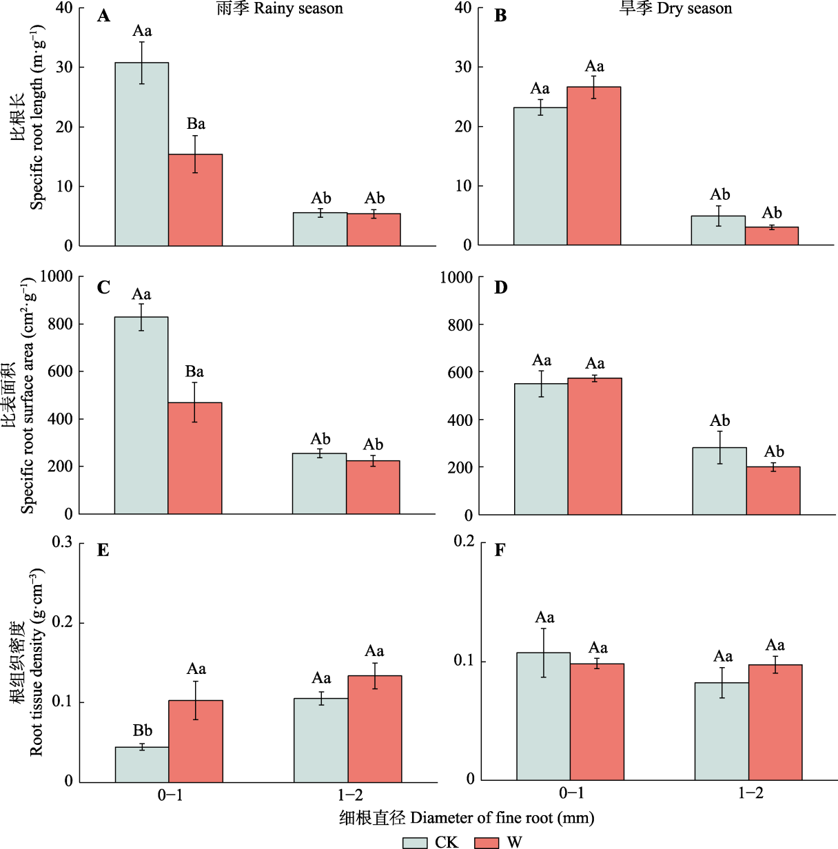 图5 增温对格氏栲天然林细根比根长、比根表面积和组织密度的影响(平均值±标准误)。CK, 对照; W, 增温。不同大写字母表示同一径级不同处理间差异显著(p < 0.05), 不同小写字母表示同一处理不同径级间差异显著(p < 0.05)。