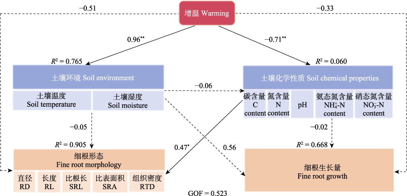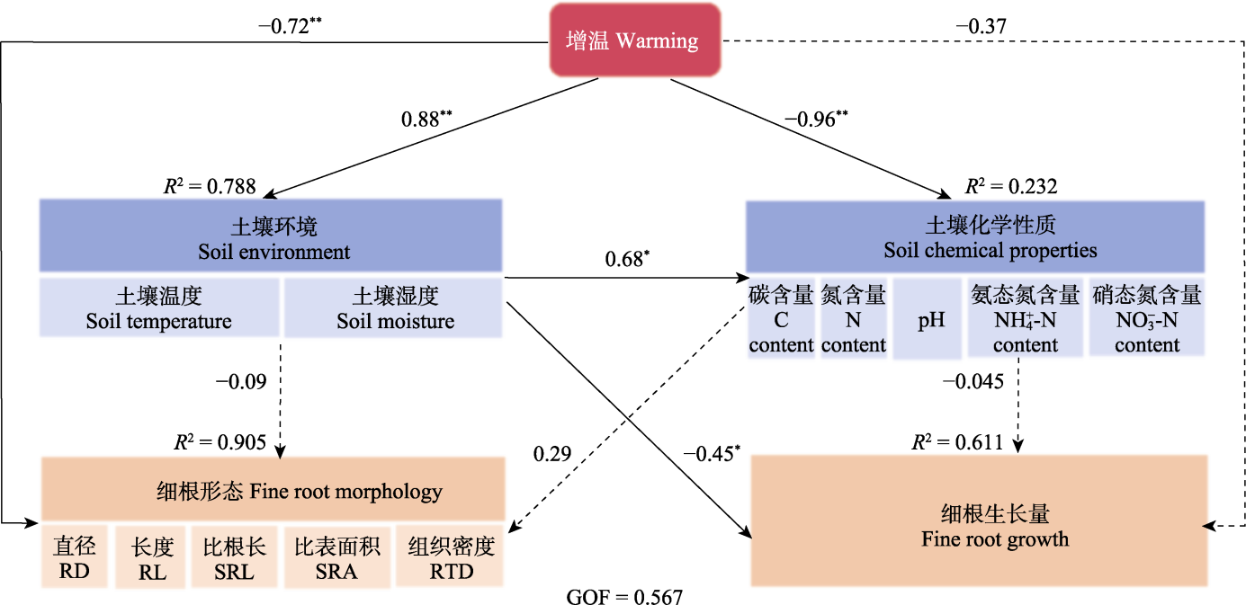 图6 偏最小二乘路径模型(PLS-PM)分析雨季增温对细根生长和形态可能的直接和间接影响途径。实线表示显著路径, 虚线表示不显著路径。箭头所列数字为标准化路径系数。*, p < 0.05; **, p < 0.01。GOF, 拟合优度。