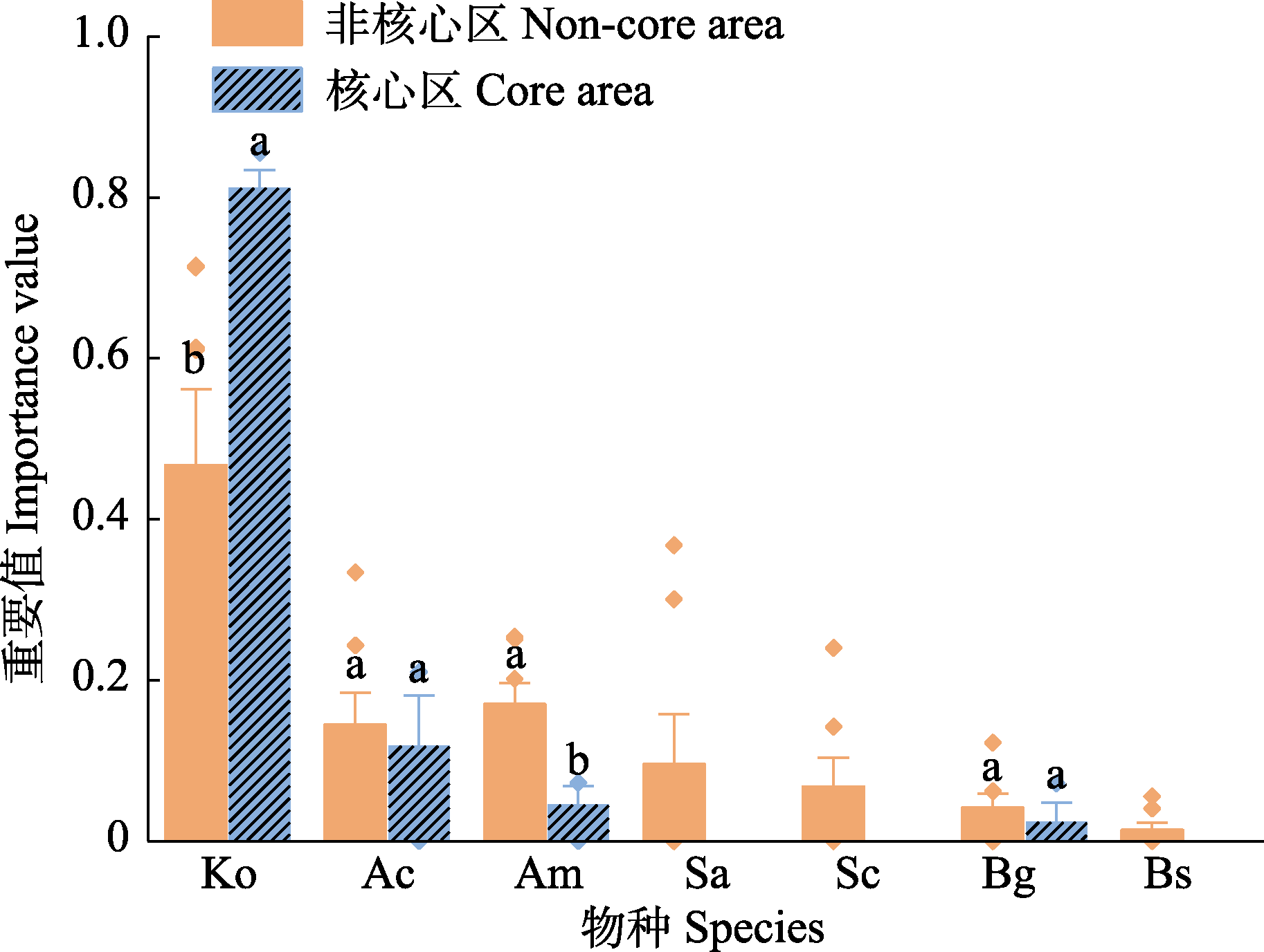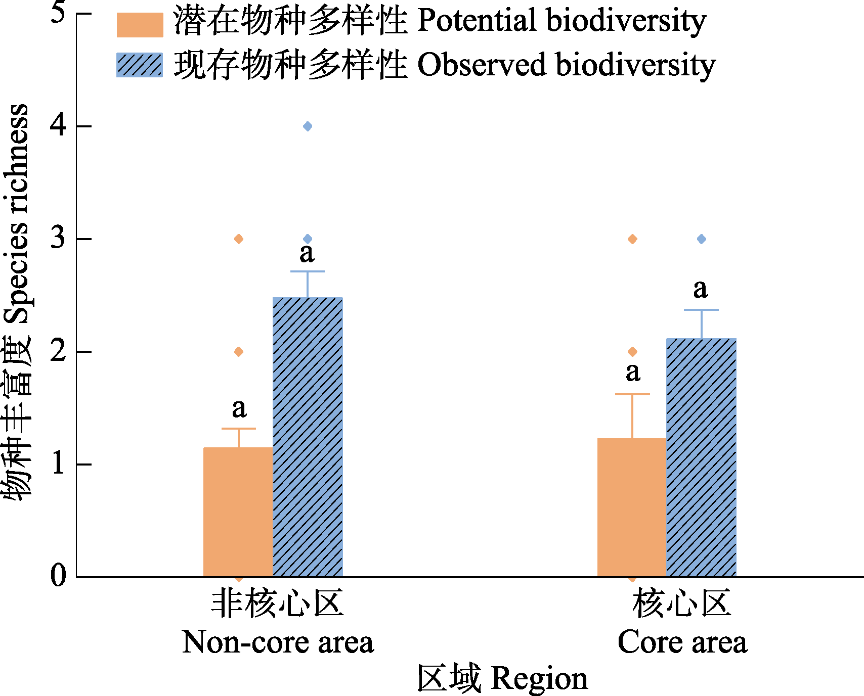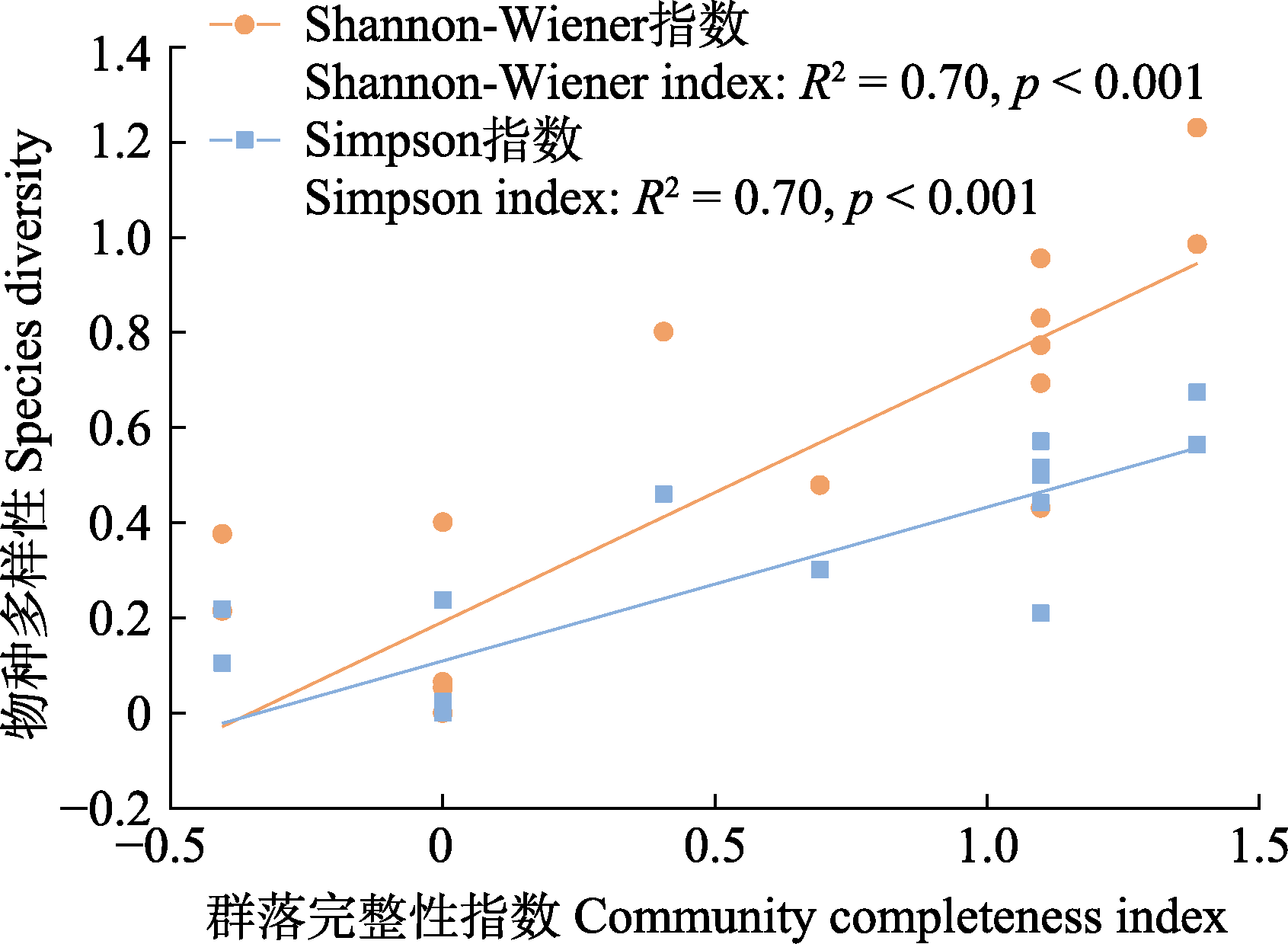 深圳湾福田红树林自然保护区是我国唯一一处位于城市腹地的国家级自然保护区。受人为干扰较重的城市红树林湿地的潜在物种多样性的研究, 可为红树林生态湿地可持续管理提供路径。该研究对深圳湾福田红树林自然保护区不同区域(核心区/非核心区)进行生态学调查, 采用超几何法评估物种共存特征与物种分布概率, 并基于调查数据分析该区域的植被特征。主要结果有: (1)深圳湾福田红树林自然保护区现分布主要有9种红树植物, 秋茄树(Kandelia obovata)是优势种; 核心区中秋茄树重要值较大(平均81.2%), 在非核心区, 秋茄树重要值显著降低, 并出现了无瓣海桑(Sonneratia apetala)与海桑(S. caseolaris)。(2)海桑与无瓣海桑存在强的共存倾向, z分数值为2.82, 而无瓣海桑与秋茄树存在竞争排斥, z分数值为-2.41, z分数值反映了物种实际分布与随机预期的偏离程度。(3)现存物种多样性与群落完整性之间具有显著正相关关系, 群落完整性越高, 则现存物种多样性越丰富。非核心区部分样方的无瓣海桑分布概率较高, 面临扩散风险。核心区秋茄树的分布概率(0.51 ± 0.09)显著高于非核心区(0.41 ± 0.15), 但核心区部分样方(如8号样带的样方)群落完整性较低, 建议适当补种本土红树, 提高物种多样性。