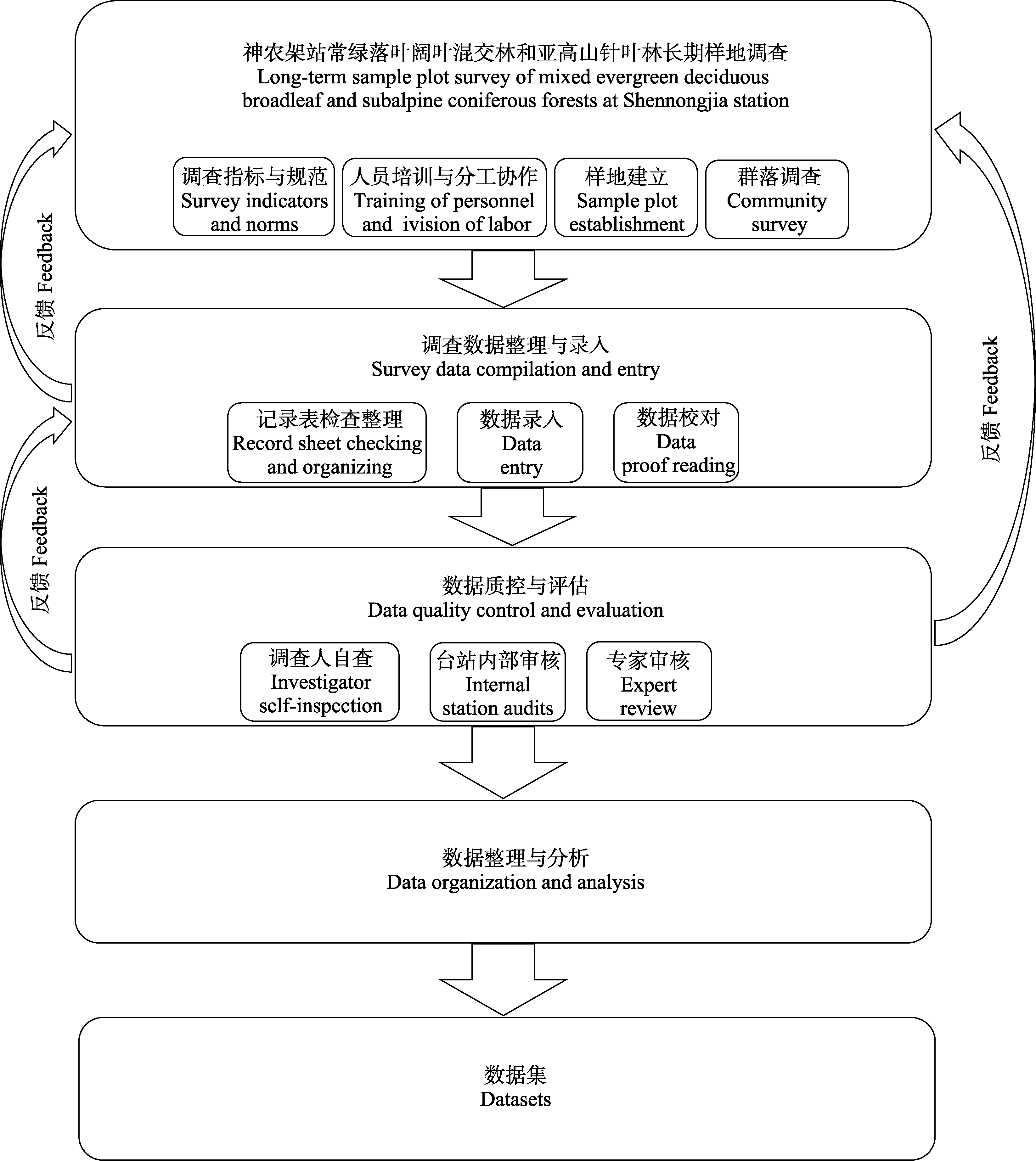 植物物种组成和群落特征是森林生态系统结构、功能和动态的基础, 决定了森林生态系统的生产力、碳固存和生物多样性保育等生态系统服务功能, 是中国生态系统研究网络(CERN)和国家生态系统观测研究网络(CNERN)陆地生态系统生物要素长期观测的重要指标。常绿落叶阔叶混交林是中国北亚热带的地带性植被类型, 是对环境变化响应敏感的植被类型之一。亚高山针叶林是神农架山地垂直带谱上部典型的植被类型, 保存有华中地区仅存的大面积原始林, 是秦巴山地重要的生态屏障。湖北神农架森林生态系统国家野外科学观测研究站暨中国科学院神农架生物多样性定位研究站于2001和2008年分别建立了100 m × 100 m的亚高山针叶林长期样地和常绿落叶阔叶混交林长期样地。2010年按照CERN和CNERN监测规范开展了植物群落清查。在100个10 m × 10 m次级样方开展乔木层调查, 在13个10 m × 10 m次级样方开展灌木层和草本层调查。乔木层的调查对象为所有胸径≥1 cm的木本植物个体, 调查指标包括植物物种名、胸径、高度等; 灌木层的监测对象为胸径<1 cm的木本植物, 调查指标包括物种名、多度、平均基径、平均高度、盖度等; 草本层的监测对象为草本植物, 调查指标包括物种名、多度、平均高度、盖度等。通过统计整理形成了该数据集的6个数据表: 森林植物群落乔木层植物物种组成数据表, 森林植物群落灌木层植物物种组成数据表, 森林植物群落草本层植物物种组成表, 森林植物群落乔木层群落特征表, 森林植物群落灌木层群落特征表, 森林植物群落草本层群落特征表。建立和共享该数据集可为深入探究环境变化对北亚热带森林生态系统的群落结构与生产力影响等相关研究提供本底数据, 为该地区的生态系统服务功能评价、生物多样性保育及生态质量监测提供基础数据支撑。