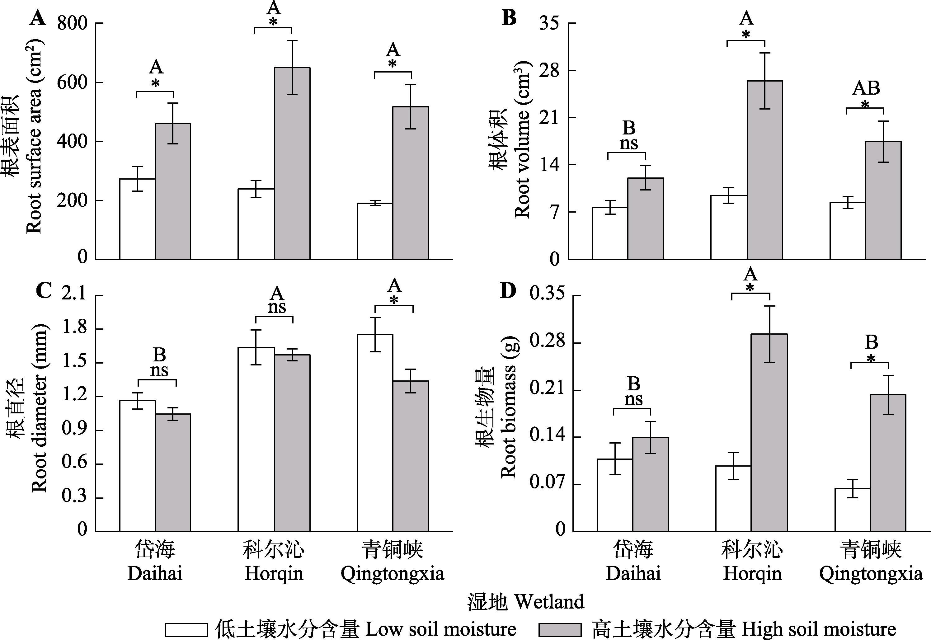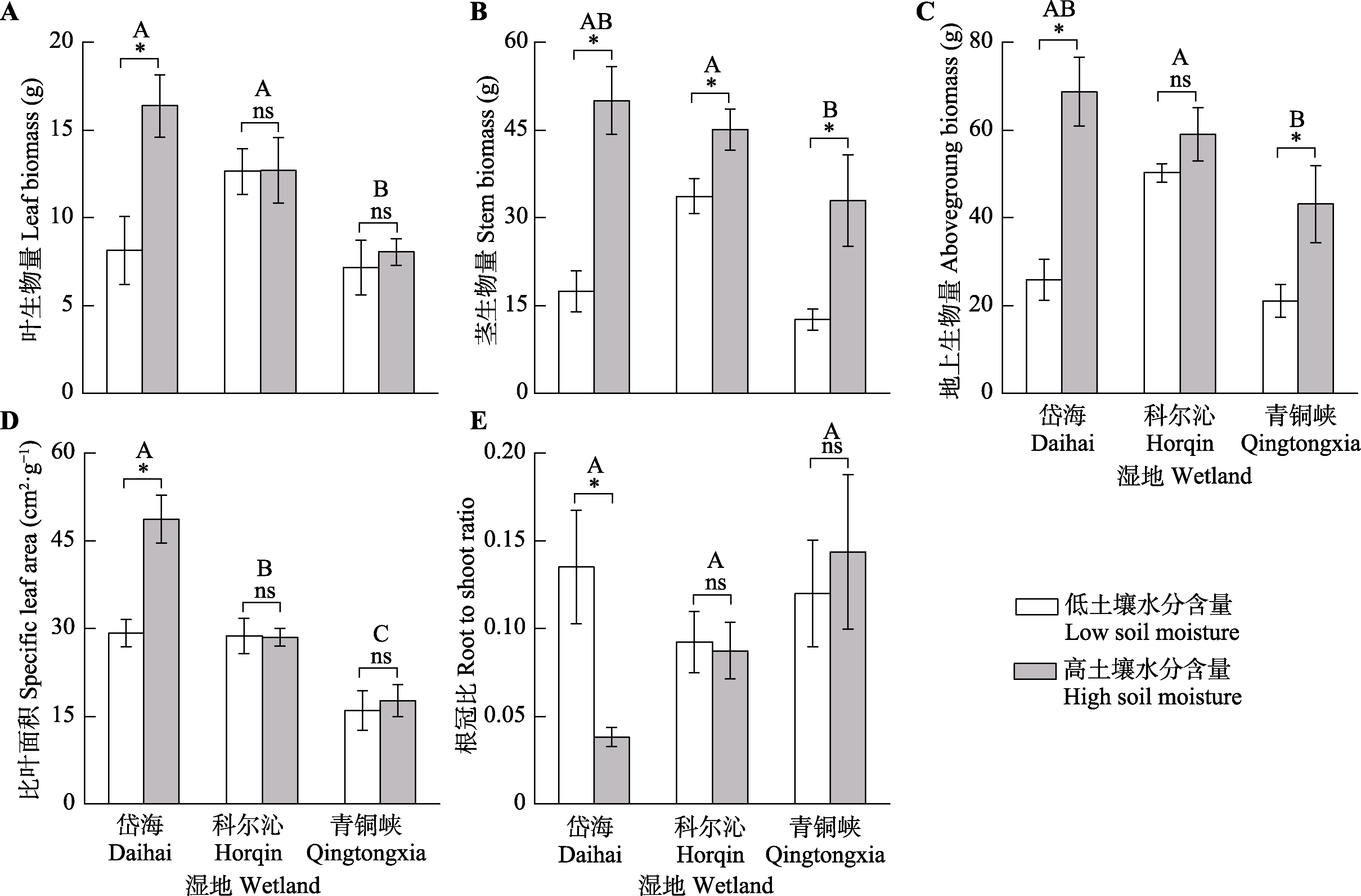 Methods In this study, P. australis communities in three typical marsh wetlands in northern China, i.e., Daihai Wetland, Horqin Wetland and Qingtongxia Reservoir, were studied, and the effects of low and high soil moisture, and other environmental factors on the aboveground traits, belowground traits and their relationships of P. australis were analyzed.