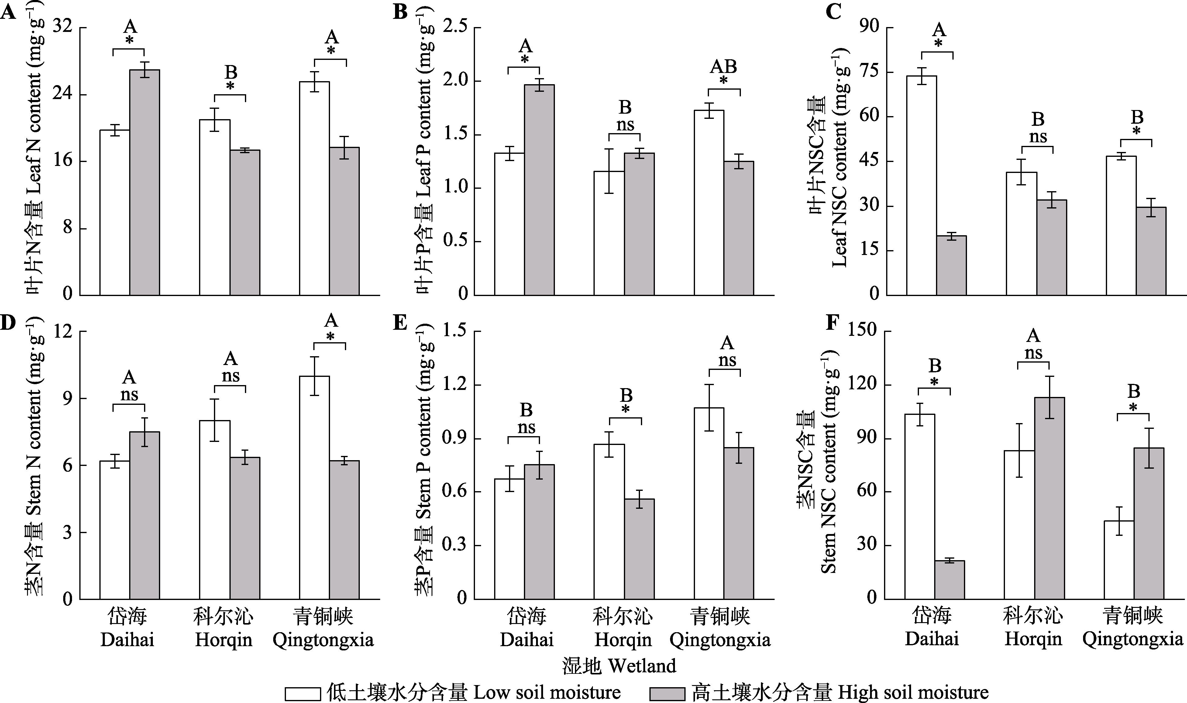 摘要: 芦苇(Phragmites australis)作为典型的根茎型多年生湿地植物, 是沼泽湿地生态系统的重要组成部分。然而, 随着全球气候变化以及湿地逐渐干旱化, 芦苇的生长常常受到水分的限制。研究芦苇对水分变化的响应可为芦苇群落的保护和动态预测以及湿地植物异质生境下响应机制的研究提供理论依据。该研究以北方3个典型沼泽湿地——岱海湿地、科尔沁湿地、青铜峡水库的芦苇群落为对象, 分析了土壤水分和其他环境因子对芦苇地上性状、地下性状及地上-地下性状关系的影响。结果表明: 相对于低土壤水分含量, 高土壤水分含量显著增加芦苇地上部分的生物量和比叶面积, 显著降低芦苇根冠比; 高土壤水分含量显著降低了芦苇的叶非结构性碳水化合物含量、茎的氮磷含量。高土壤水分含量显著增加了芦苇的根生物量、根表面积和根体积, 显著降低了芦苇的根直径。土壤水分不影响根生物量与茎非结构性碳水化合物含量的正相关关系, 但土壤水分含量的降低会逆转高土壤水分含量下根直径与叶氮含量的负相关关系, 以及与叶非结构性碳水化合物含量、茎非结构性碳水化合物含量的正相关关系。高土壤水分含量下芦苇性状主要受土壤总氮、总磷含量的影响; 低土壤水分含量下芦苇性状主要受温度和降水影响, 表明土壤水分可能通过间接影响土壤总氮、总磷含量和温度, 改变部分地上-地下性状的相关关系。综上, 高土壤水分含量有利于芦苇地上部分和根系生长, 但降低芦苇茎氮磷含量和叶非结构性碳水化合物含量。土壤水分可通过影响土壤氮磷含量和温度, 间接影响芦苇的地上和地下性状及其关系。