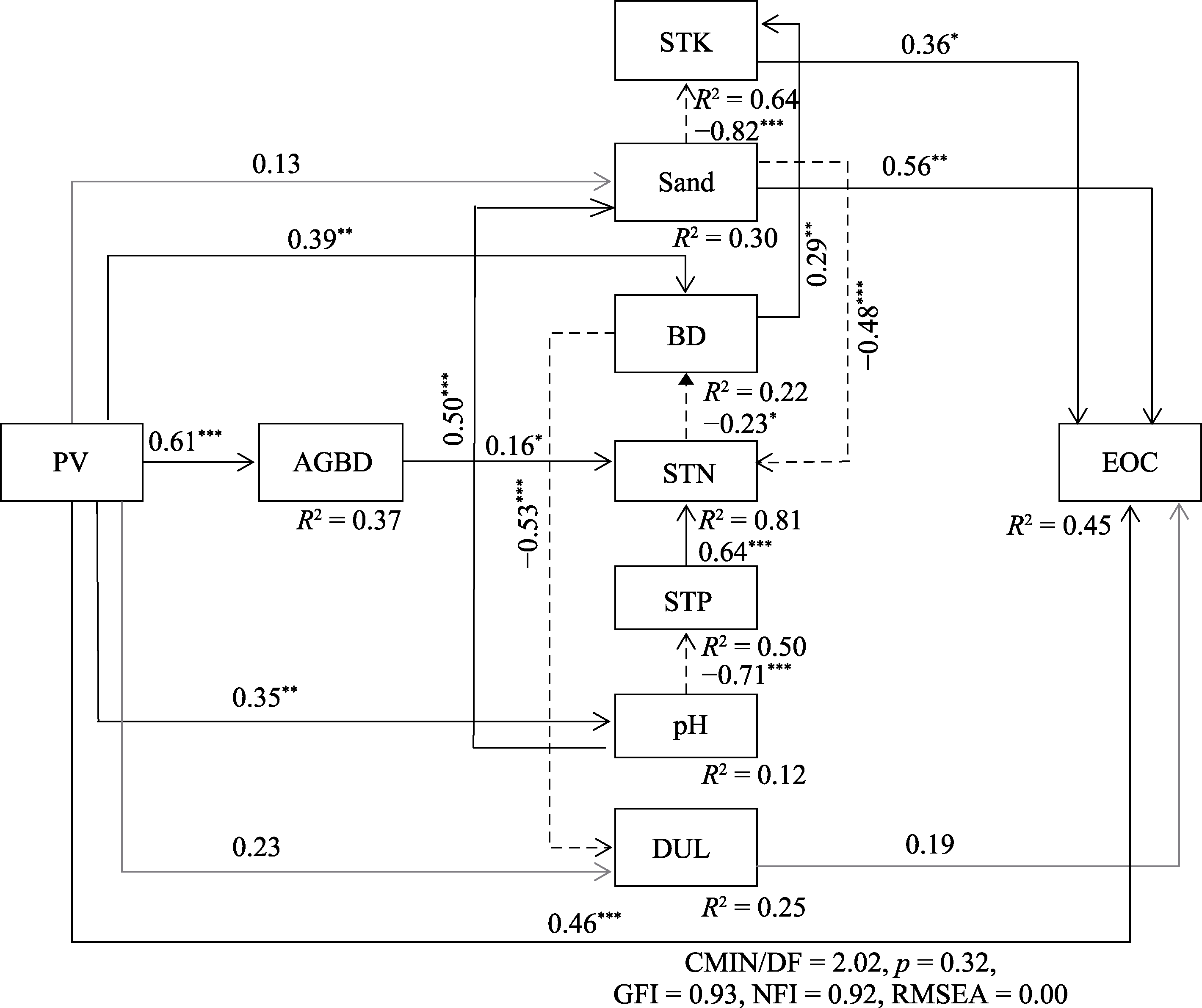 Fig. 10 Structural equation model of drivers of easily oxidizable organic carbon stock (EOC) in soils. AGBD, above ground biomass carbon density; BD, soil bulk density; DUL, field capacity; PV, power plant construction year; Sand, soil sand content; STK, soil total potassium content; STN, soil total nitrogen content; STP, soil total phosphorus content. Solid black lines represent significant positive impacts; dashed black lines represent significant negative impacts; solid gray lines represent non-significant positive impacts. *, p < 0.05; **, p < 0.01; ***, p < 0.001.