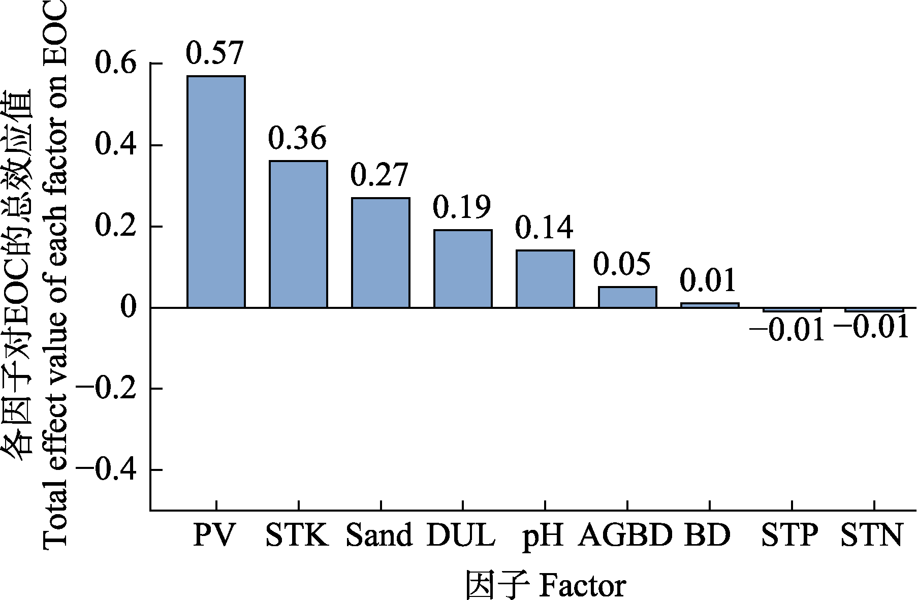 Fig. 11 Total effect values of the factors on readily oxidizable organic carbon stock (EOC) in soils in the structural equation model. AGBD, above ground biomass carbon density; BD, soil bulk density; DUL, field capacity; PV, power plant construction year; Sand, soil sand content; STK, soil total potassium content; STN, soil total nitrogen content; STP, soil total phosphorus content.