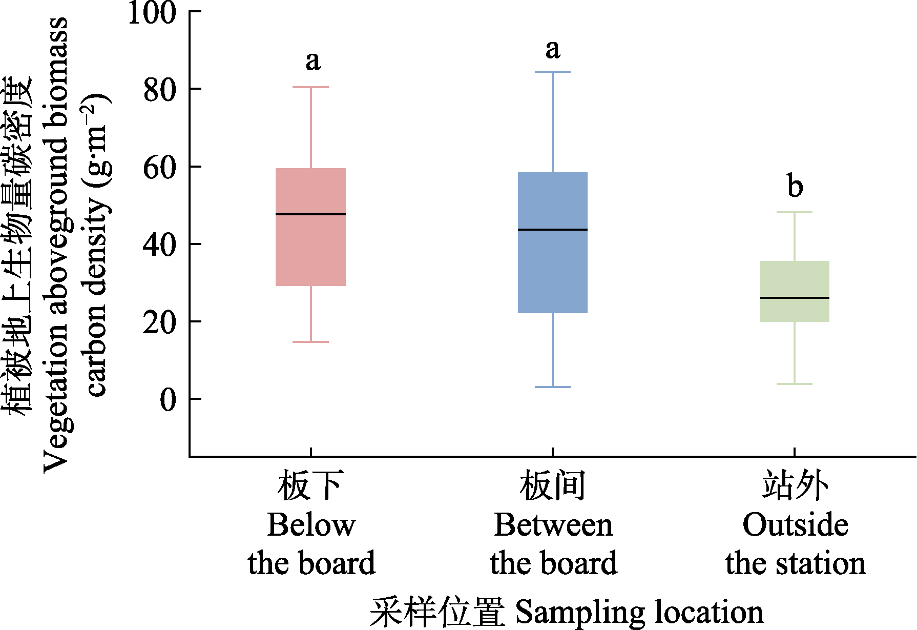 图2 光伏板下、板间和站外植被地上生物量碳密度的单因素方差分析。不同小写字母代表观测指标在不同采样位置之间差异显著(p < 0.05)。