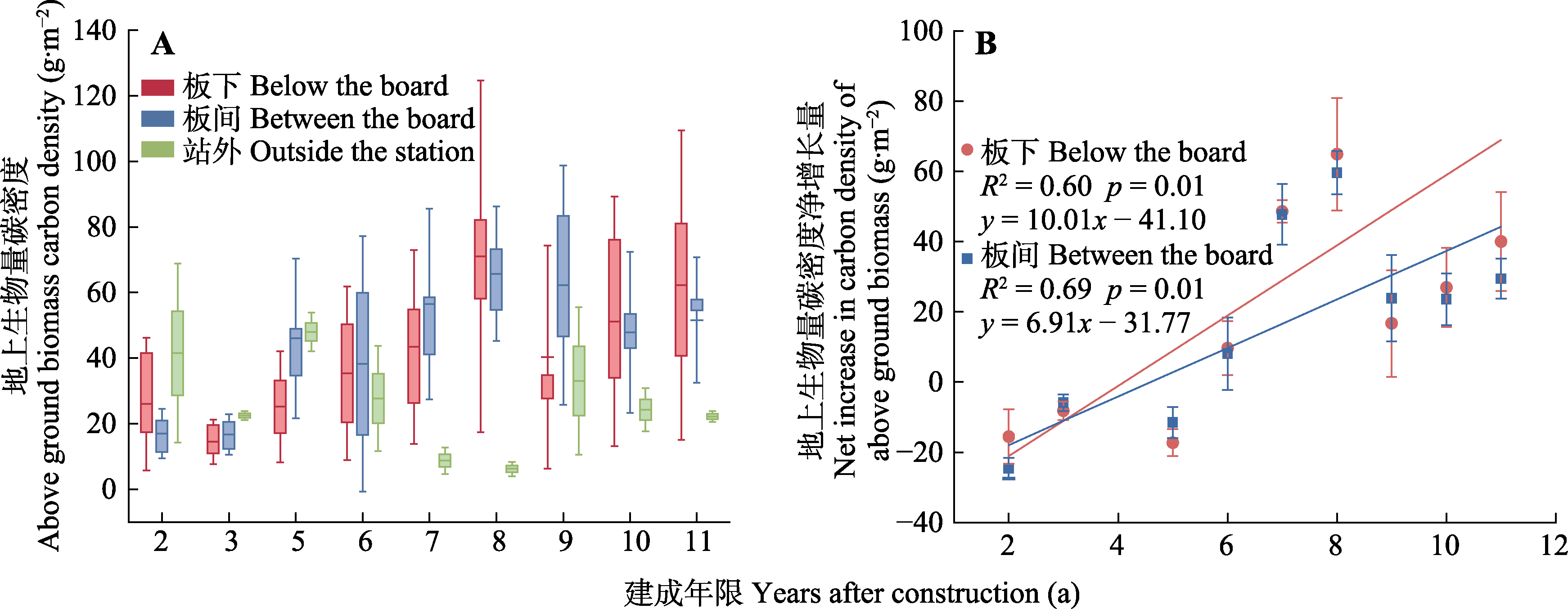 图3 不同光伏电站建成年限板下、板间和站外植被地上生物量碳密度的比较(A), 以及植被地上生物量碳密度净增长量(平均值±标准误)随光伏电站建成年限的变化(B)。