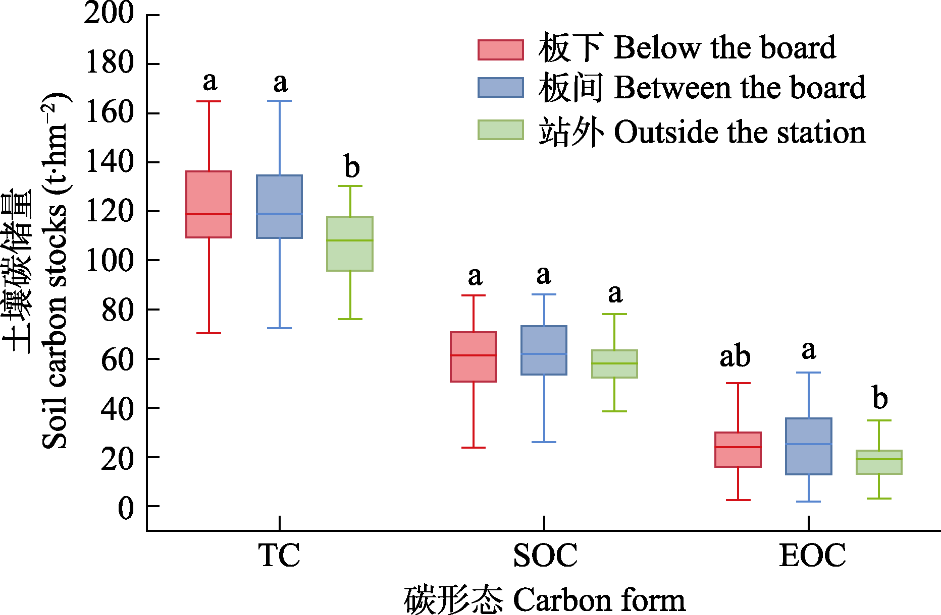 图4 光伏板下、板间和站外土壤碳储量的单因素方差分析。EOC, 易氧化有机碳; SOC, 有机碳; TC, 总碳。不同小写字母代表观测指标在不同采样位置之间差异显著(p < 0.05)。