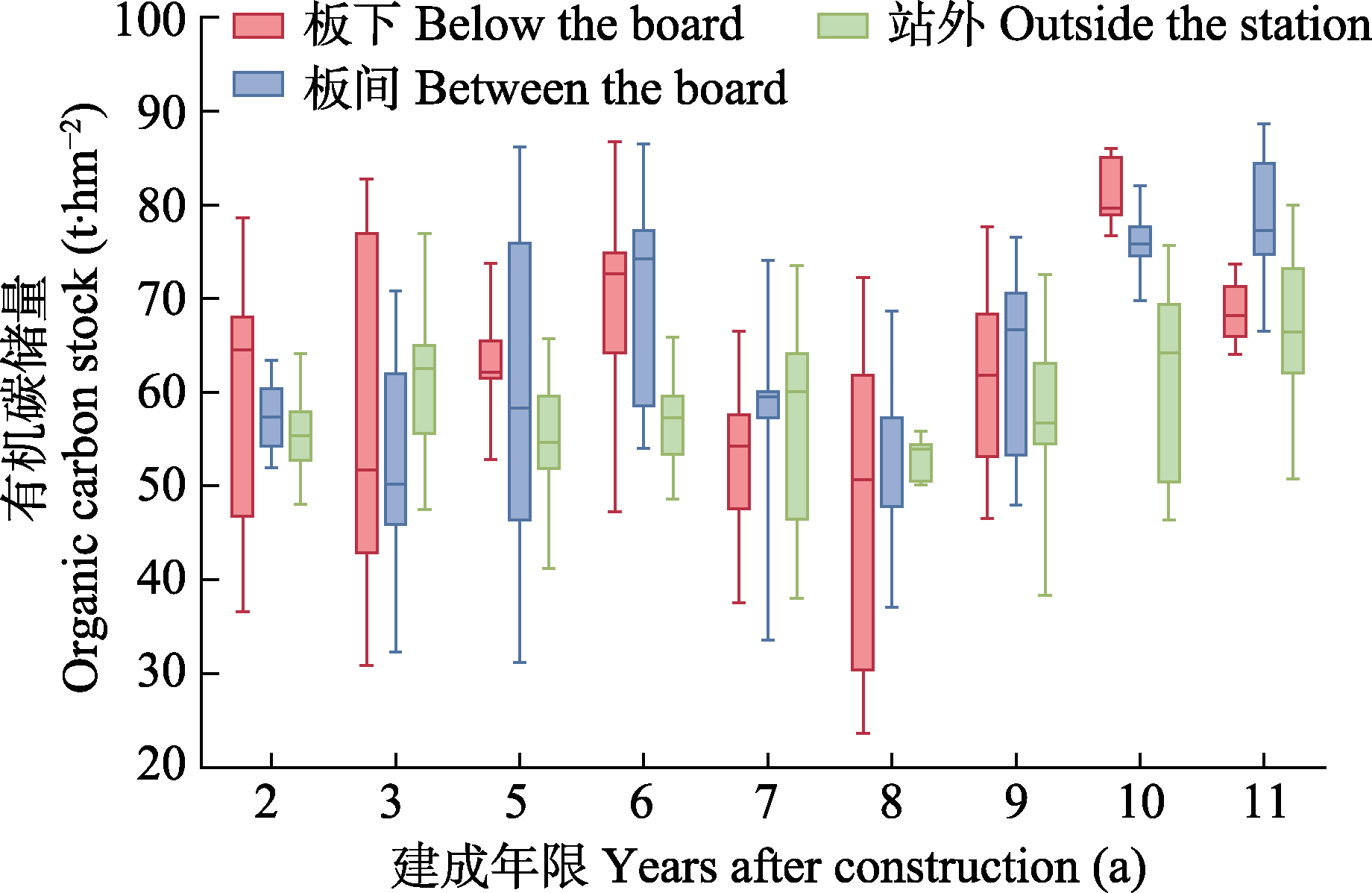 图5 不同建成年限光伏电站板下、板间和站外有机碳储量的比较。