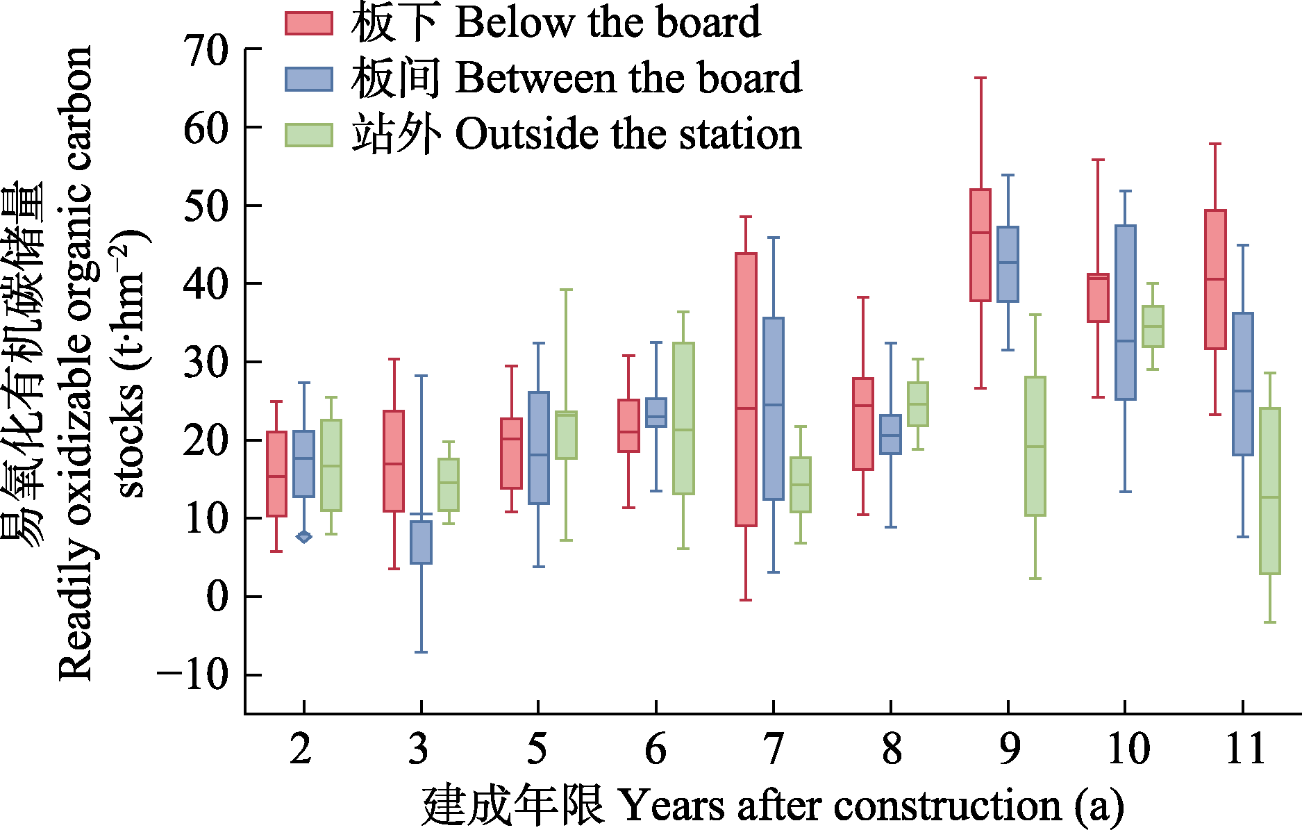 图6 不同建成年限光伏电站板下、板间和站外易氧化有机碳储量的比较。