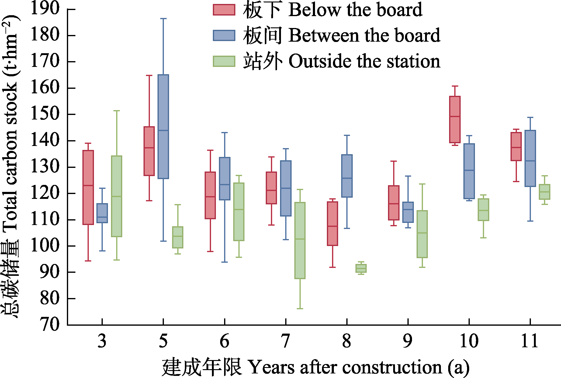 图7 不同建成年限光伏电站板下、板间和站外总碳储量的比较。