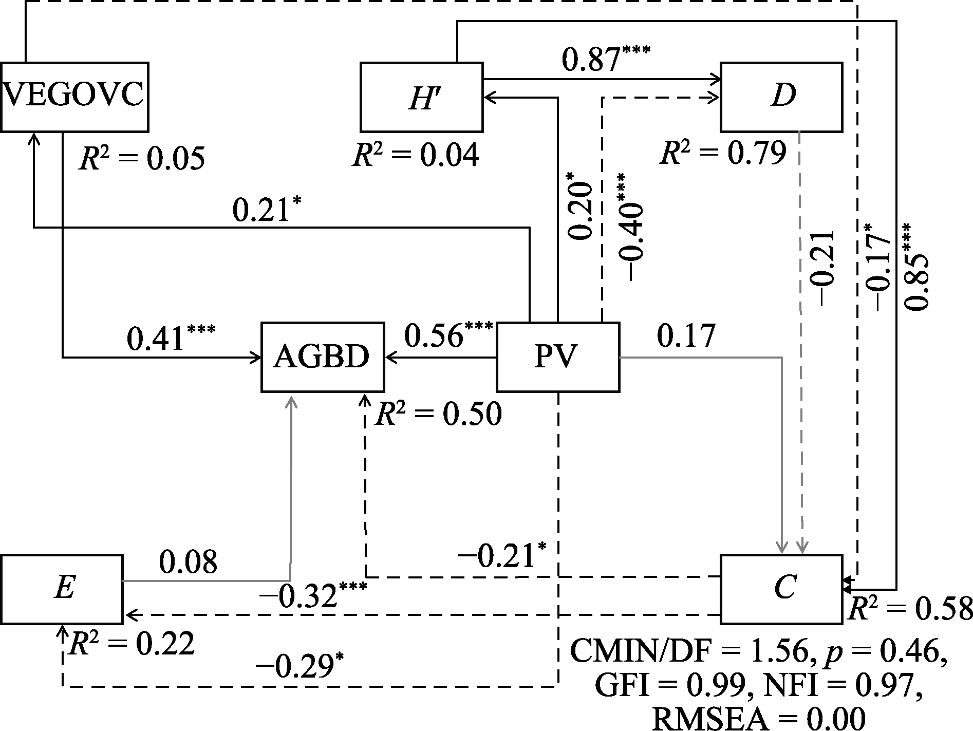 Fig. 8 Structural equation model of drivers of aboveground biomass carbon density. Solid black lines represent significant positive impacts; dashed black lines represent significant negative impacts; solid gray lines represent non-significant positive impacts; and dashed gray lines represent non-significant negative impacts. *, p < 0.05; **, p < 0.01; ***, p < 0.001. AGBD, above ground biomass carbon density; C, Margalef richness index; D, Simpson dominance index; E, Pielou evenness index; H′, Shannon-Wiener diversity index; PV, photovoltaic power plant construction time; VEGOVC, vegetation coverage.