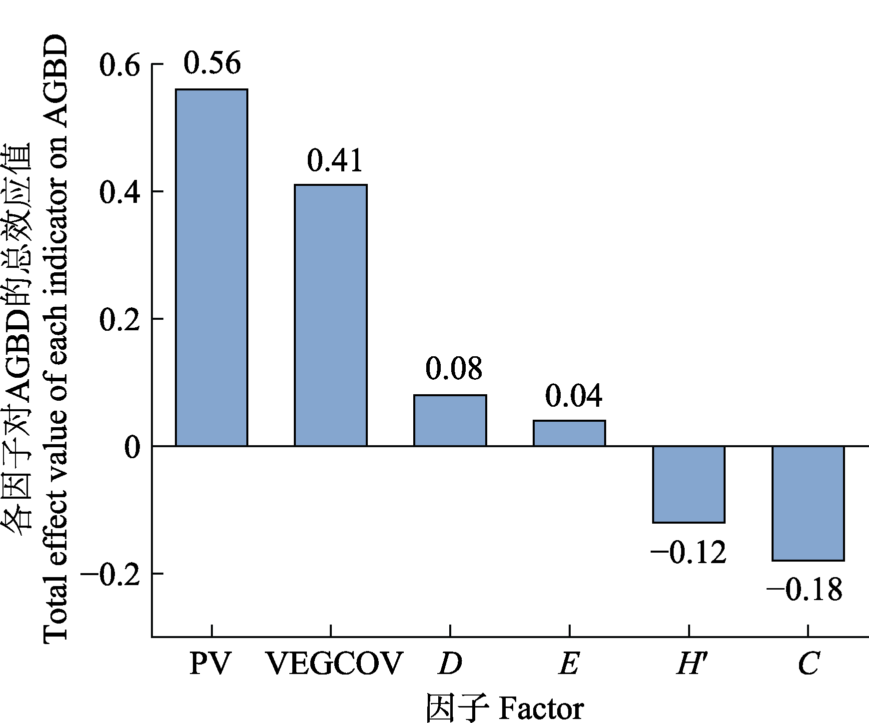 Fig. 9 Total effect values of the factors on the aboveground biomass carbon density in the structural equation model. AGBD, above ground biomass carbon density; C, Margalef richness index; D, Simpson dominance index; E, Pielou evenness index; H′, Shannon-Wiener diversity index; PV, photovoltaic power plant construction time; VEGOVC, vegetation coverage.