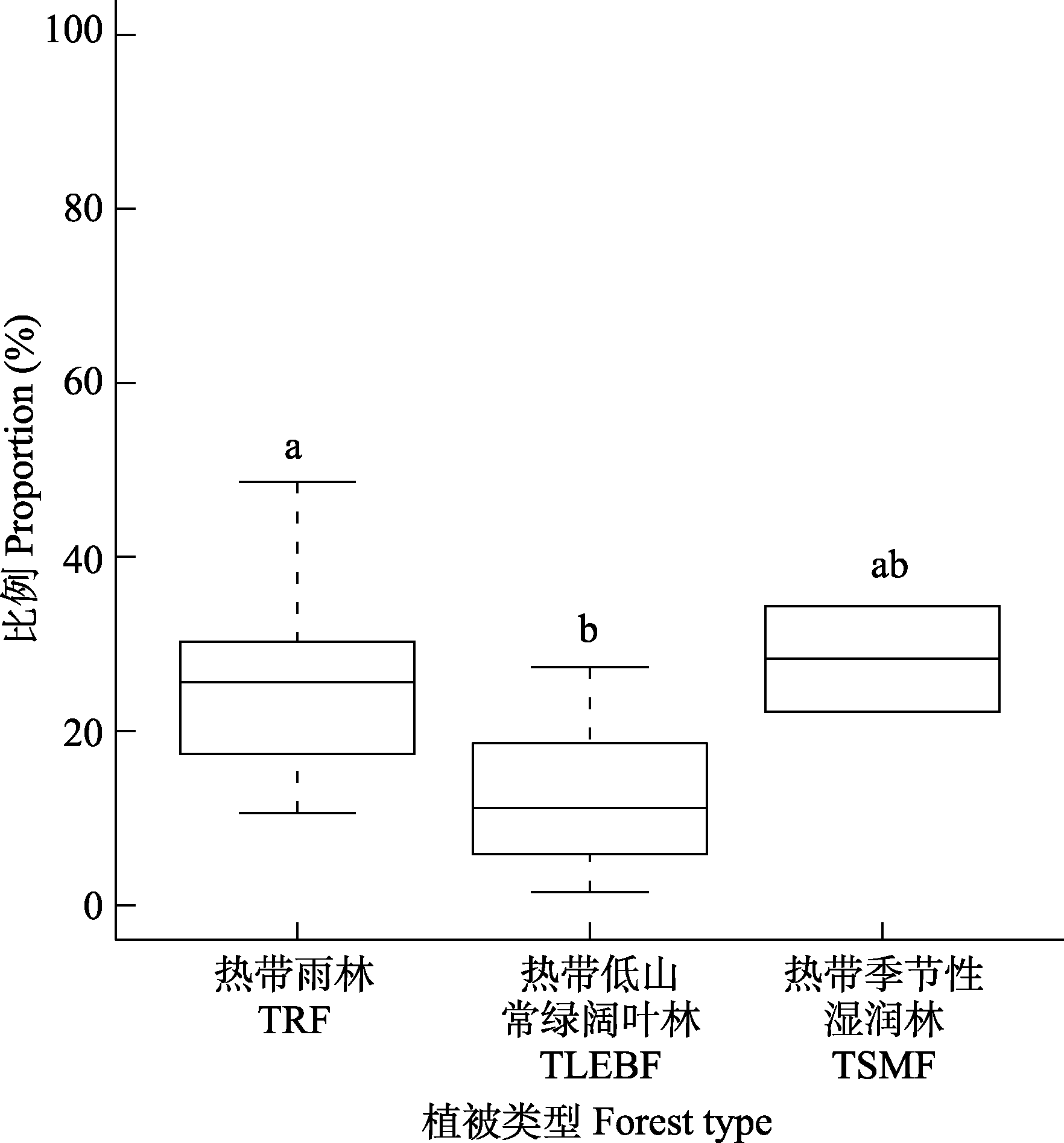 图2 西双版纳不同植被类型间的整体藤本攀附比率。箱式图表示数据的四分位数(IQR)范围(第25百分位数至第75百分位数), 箱中横线为藤本攀附比率中位数, 上下须之间表示99.3%置信区间。不同小写字母代表不同植被类型间的藤本攀附比率差异显著(p < 0.05)。