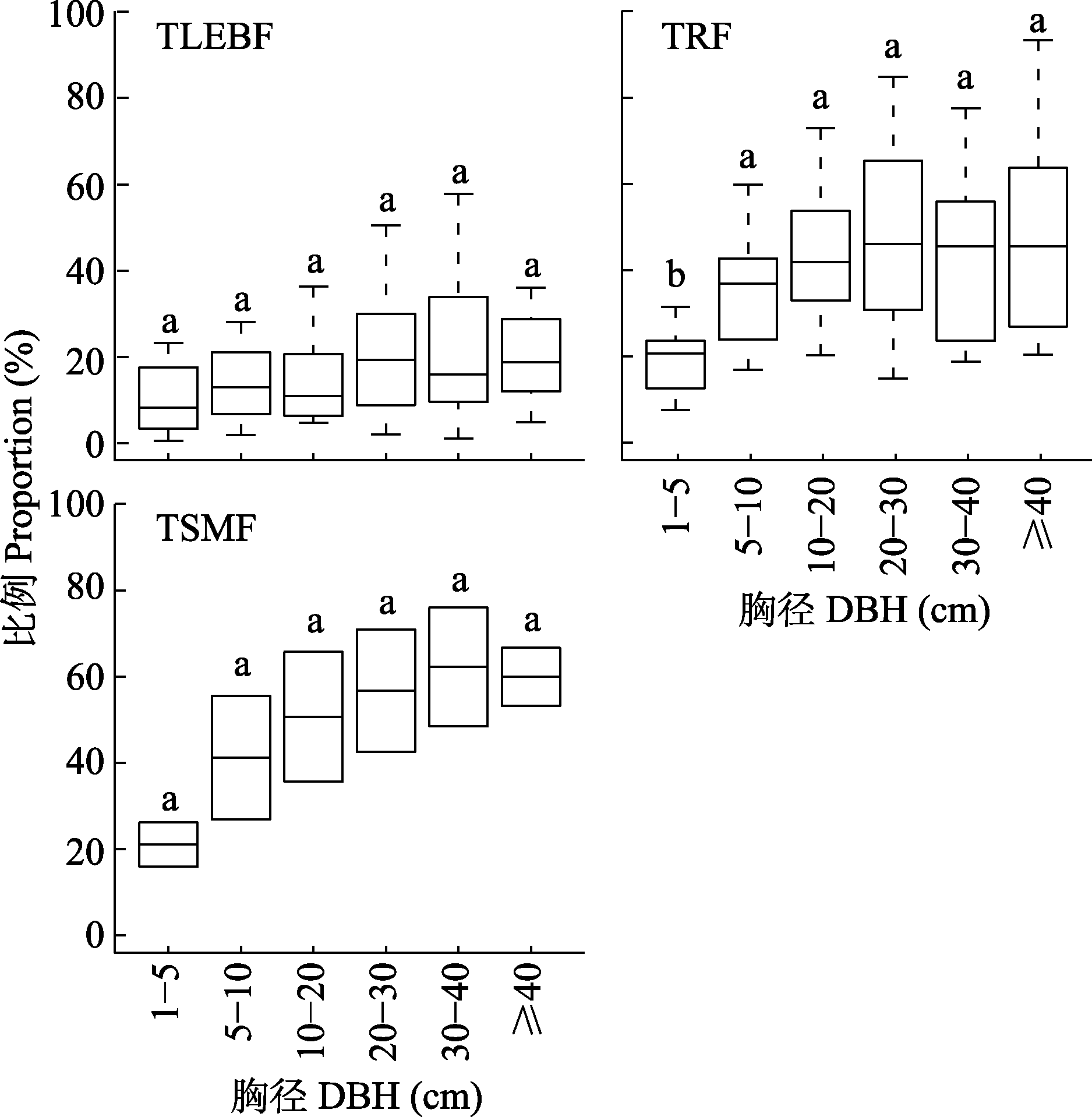 图3 西双版纳热带低山常绿阔叶林(TLEBF)、热带雨林(TRF)和热带季节性湿润林(TSMF)各树木径级的藤本攀附比率。箱式图表示数据的四分位数(IQR)范围(第25百分位数至第75百分位数), 箱中横线为藤本攀附比率中位数, 上下须之间表示99.3%置信区间。不同小写字母代表不同植被类型间的藤本攀附比率差异显著(p < 0.05)。