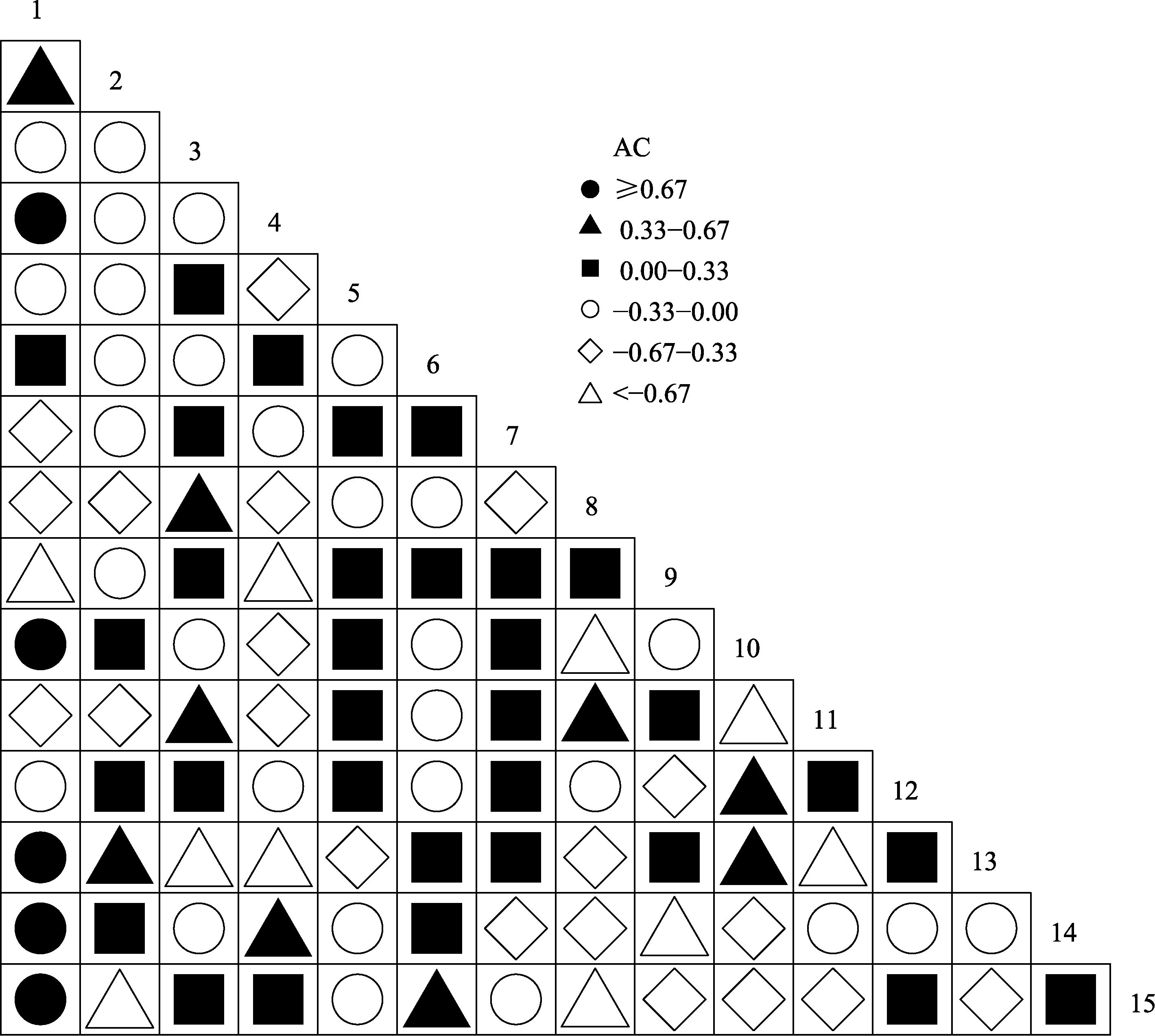 Fig. 2 Correlation coefficients(AC) of major herbaceous plants in the Glycine soja community in the suburbs of Shenyang. Species represented by numbers 1-15 in the table are the same as those in Table 1.