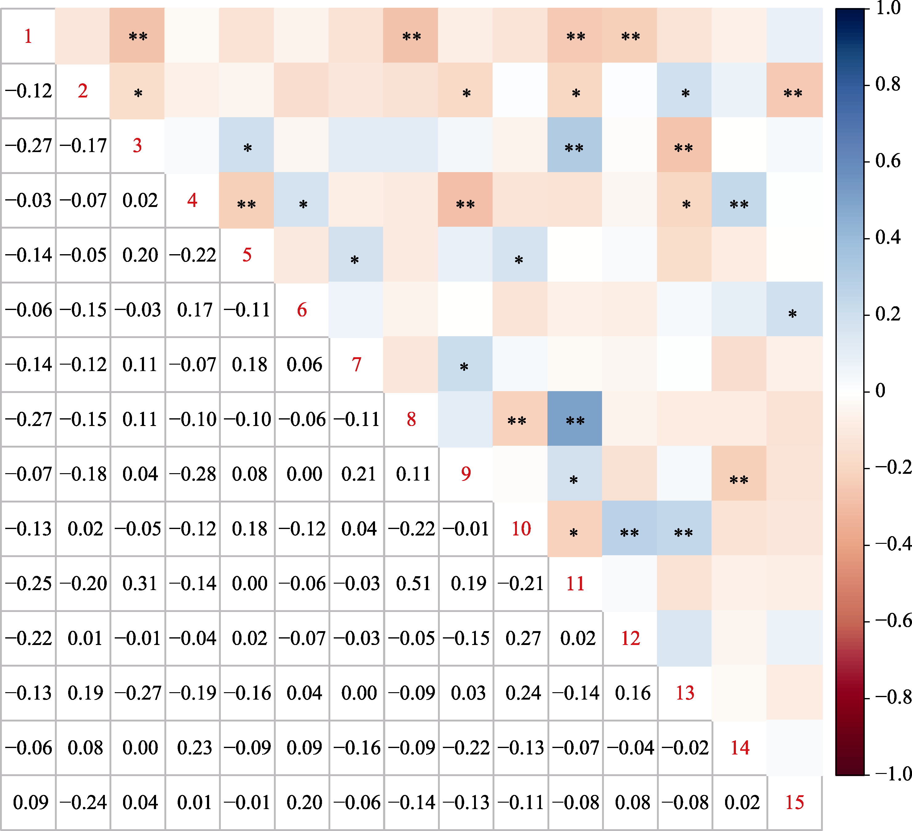 Fig. 3 Spearman rank correlation coefficient of major herbaceous plants in the Glycine soja community in the suburbs of Shenyang. *, p < 0.05; **, p < 0.01. Species represented by numbers 1-15 in the table are the same as those in Table 1.