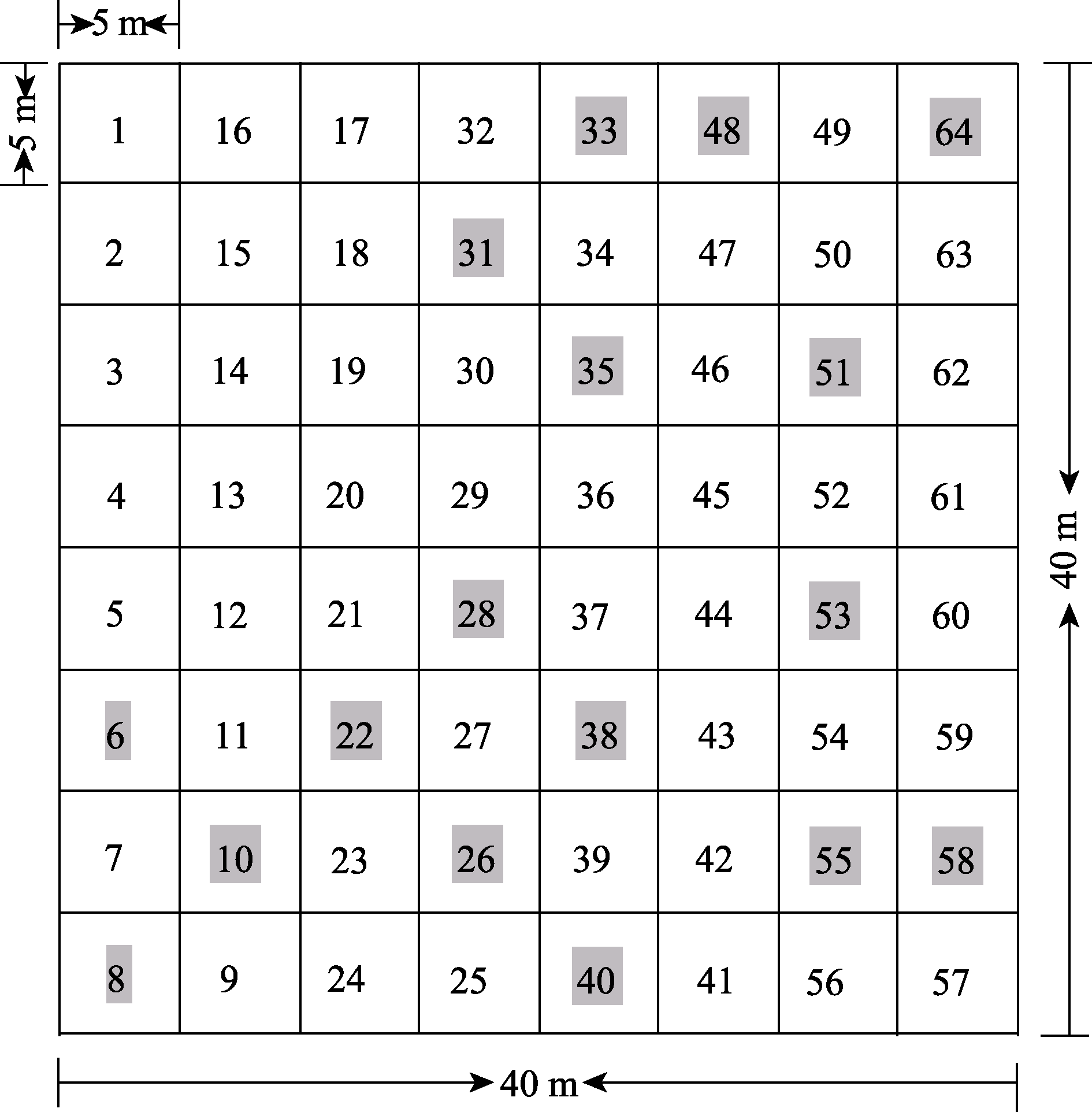Fig. 1 Schematic diagram of the spatial distribution of second level plot in the Changbai Mountain broadleaf Korean pine forest permanent plot. Shaded plots are monitoring plots for shrub layer and herb layer.