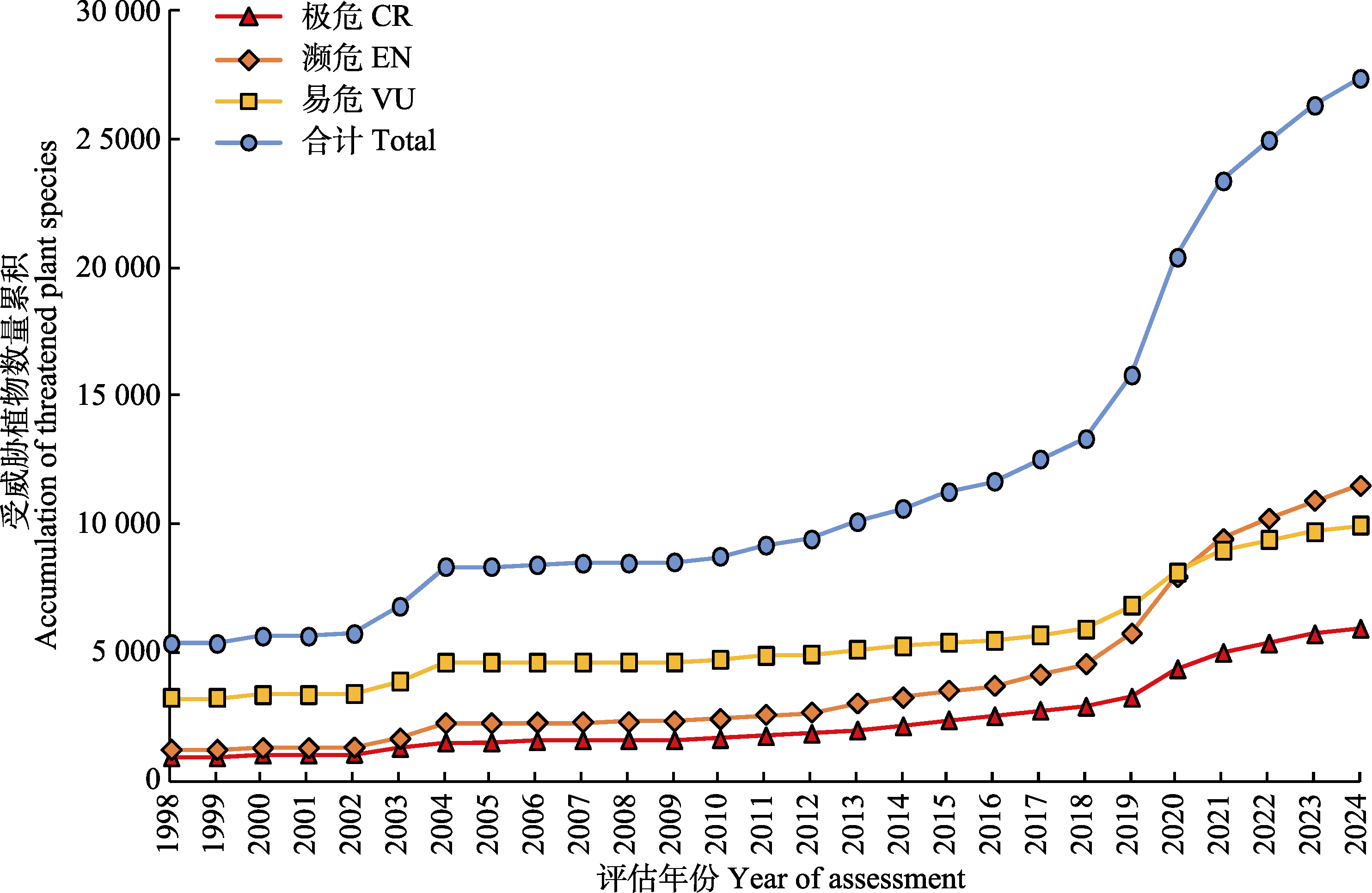 图1 IUCN评估数据库中受威胁植物累积数量(1998-2024, 截止到2024年6月27日)。数据来源: https://www.iucnredlist.org/resources/summary-statistics。