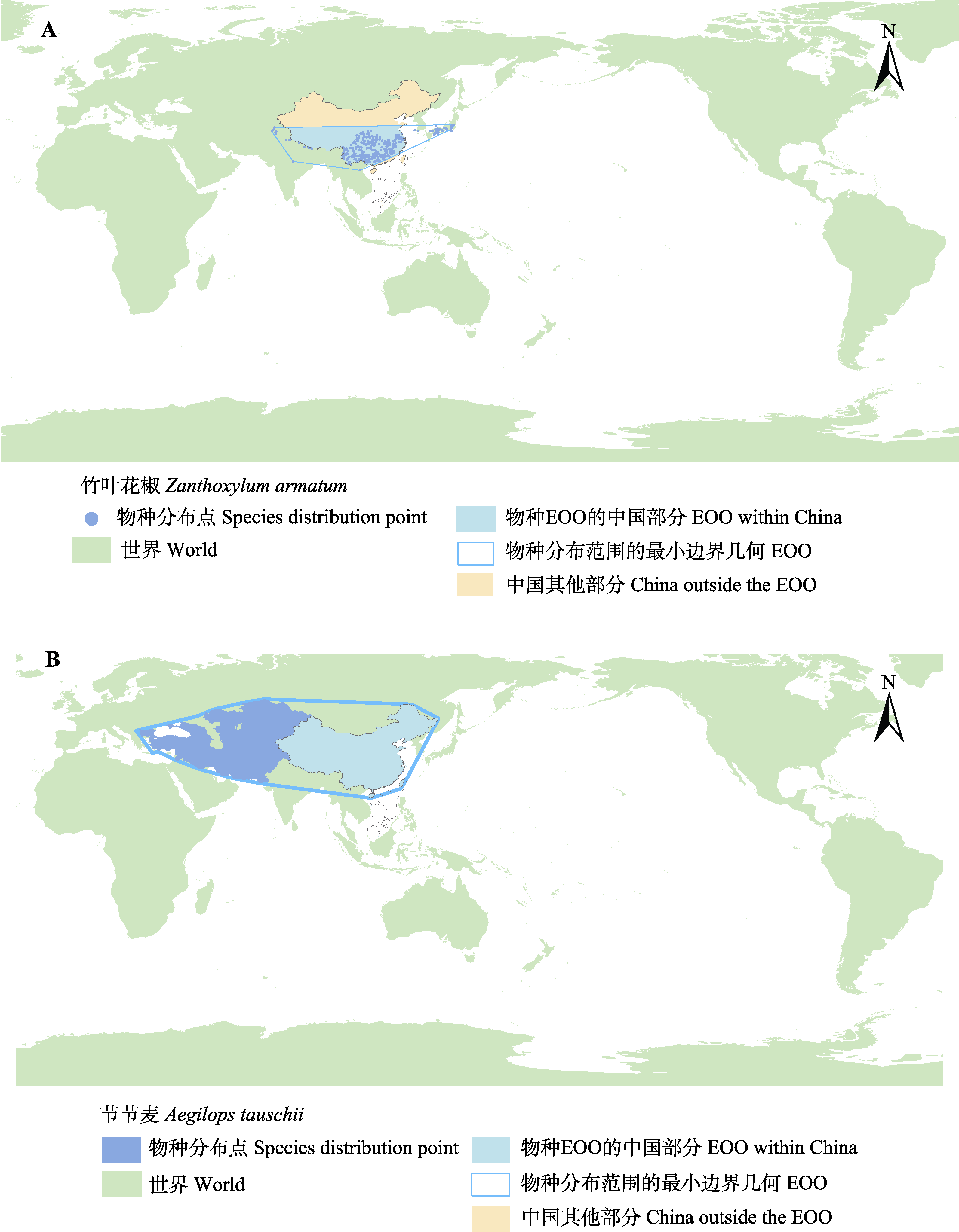 图3 物种占有面积(EOO)划定方法举例。A, 竹叶花椒, 分布数据源为点类型。B, 节节麦, 分布数据源为面类型。