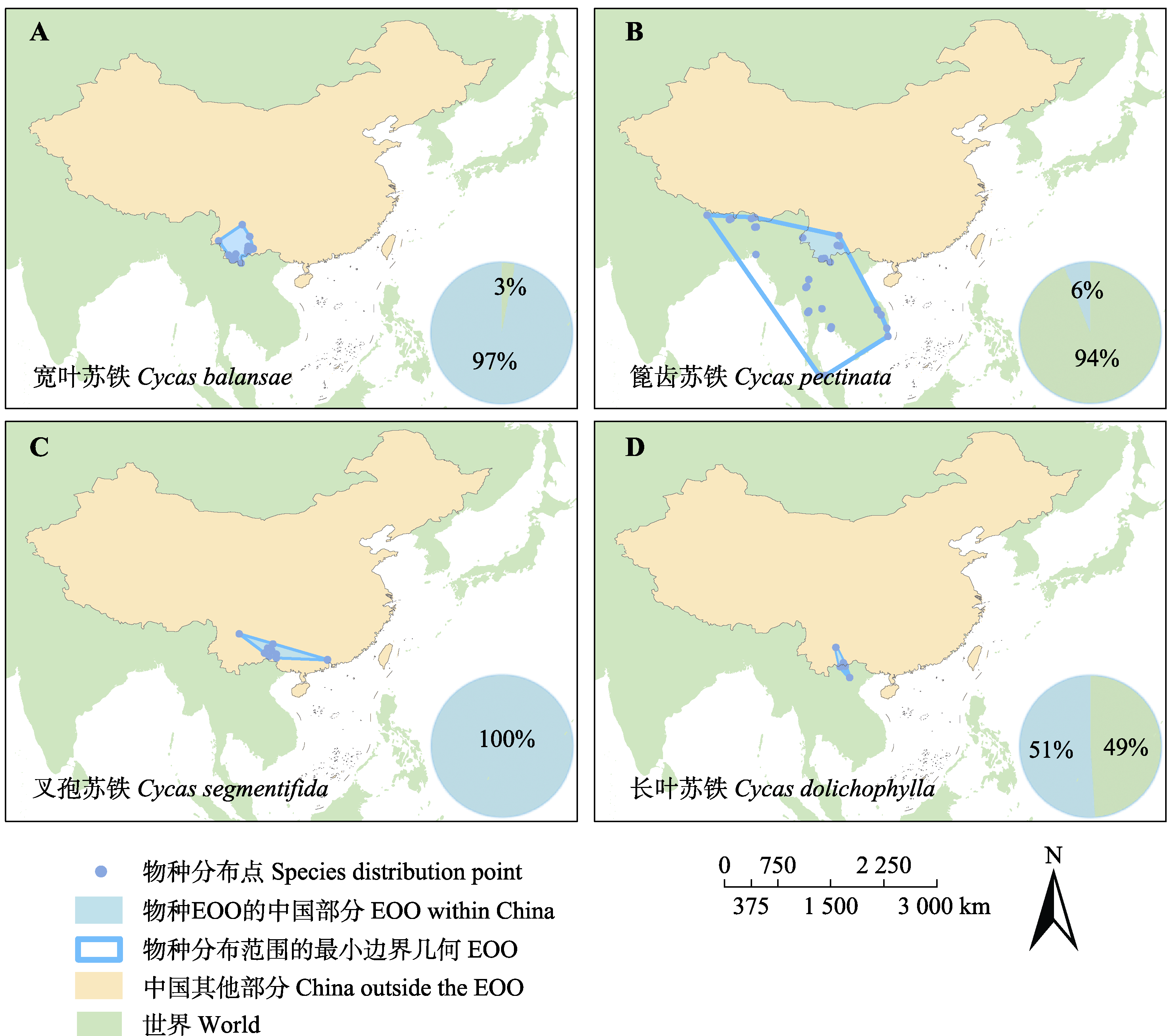 图4 4种代表性苏铁类植物的分布点、占有面积(EOO)及其在中国境内和境外的分割情况。图中右下角的饼图表示EOO在中国和中国以外区域的面积占比。