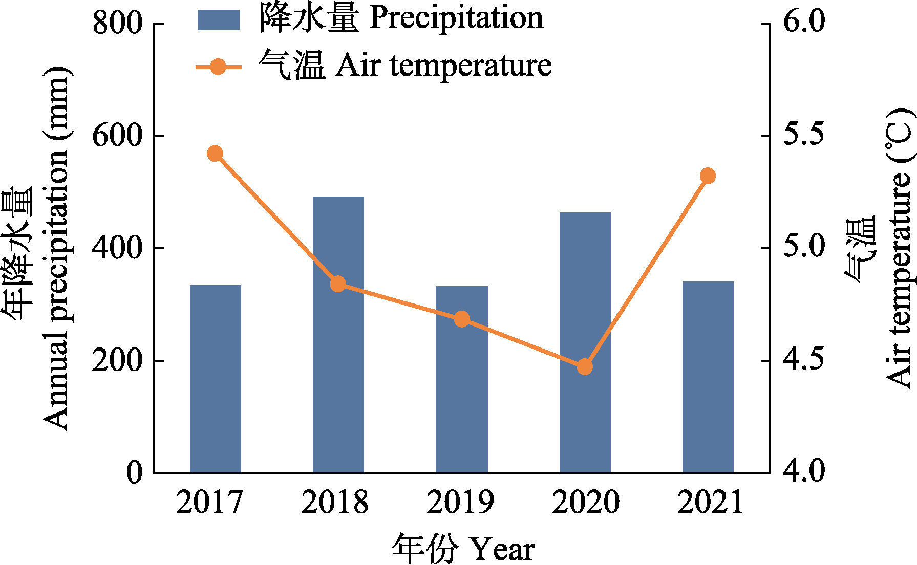 Fig. 1 Annual precipitation and air temperature during 2017-2021 at the study site in Leymus secalinus grassland in Northern Shanxi.